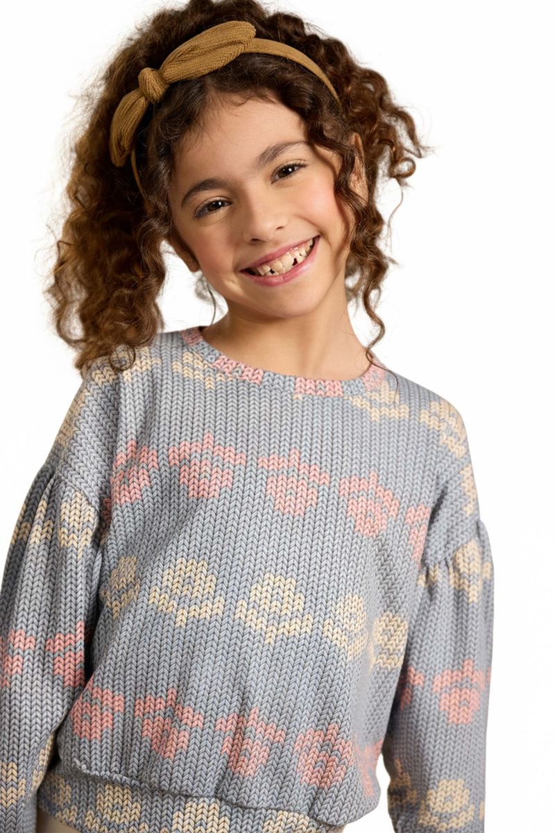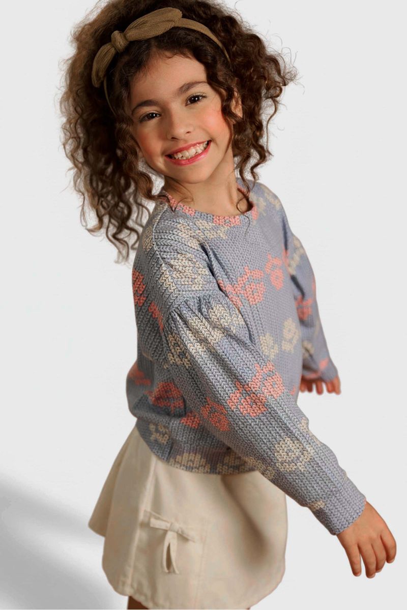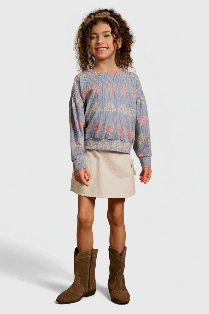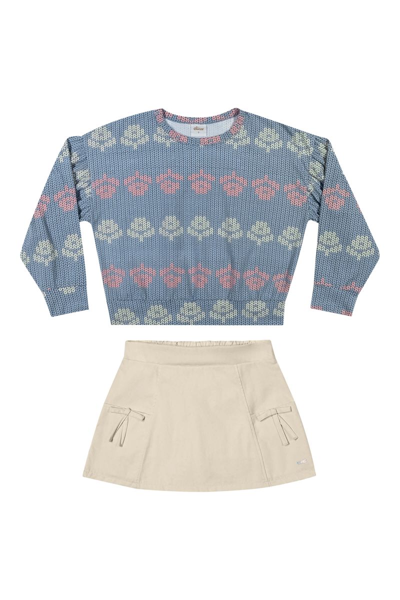 • Conjunto composto por blusa e saia • Feito em cotton leve e sarja • Possui mangas longas com franzidos nos ombros • Possui estampa floral com efeito tricô • Possui elástico no cós • Possui short interno • Possui bolsos laterais e detalhes em laços • Ideal para momentos especiais
