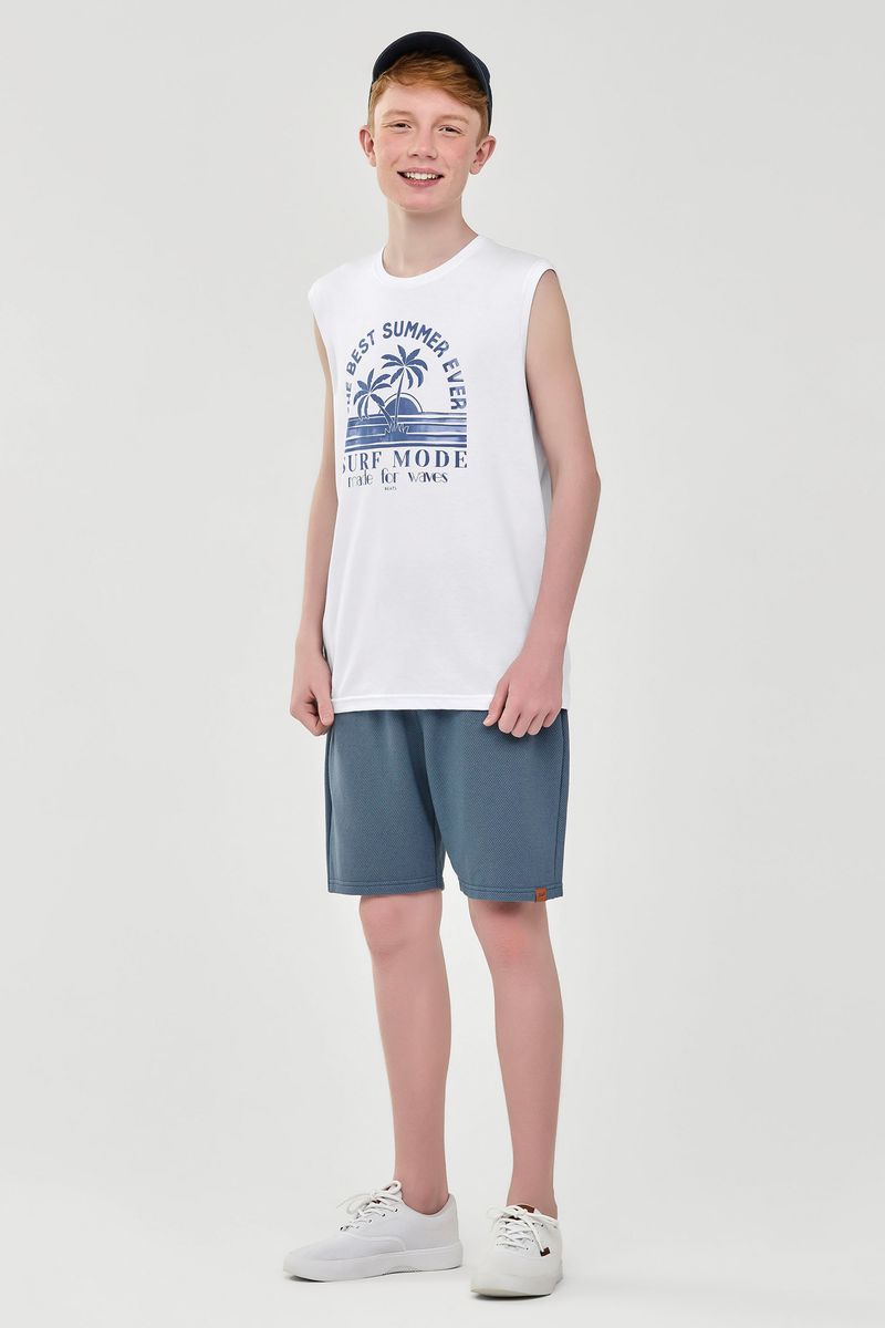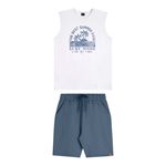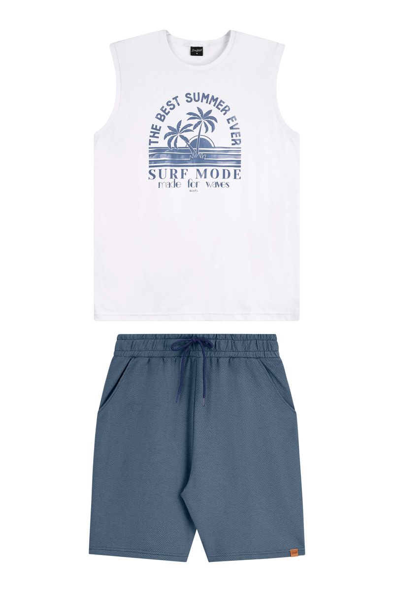 • Conjunto composto por regata e bermuda • Feito em meia malha e moletom de linho • Possui estampa tropical • Possui elástico no cós • Possui bolsos • Ideal para curtir os dias de sol
