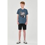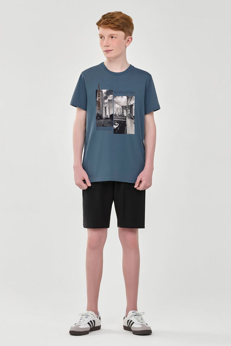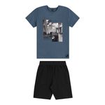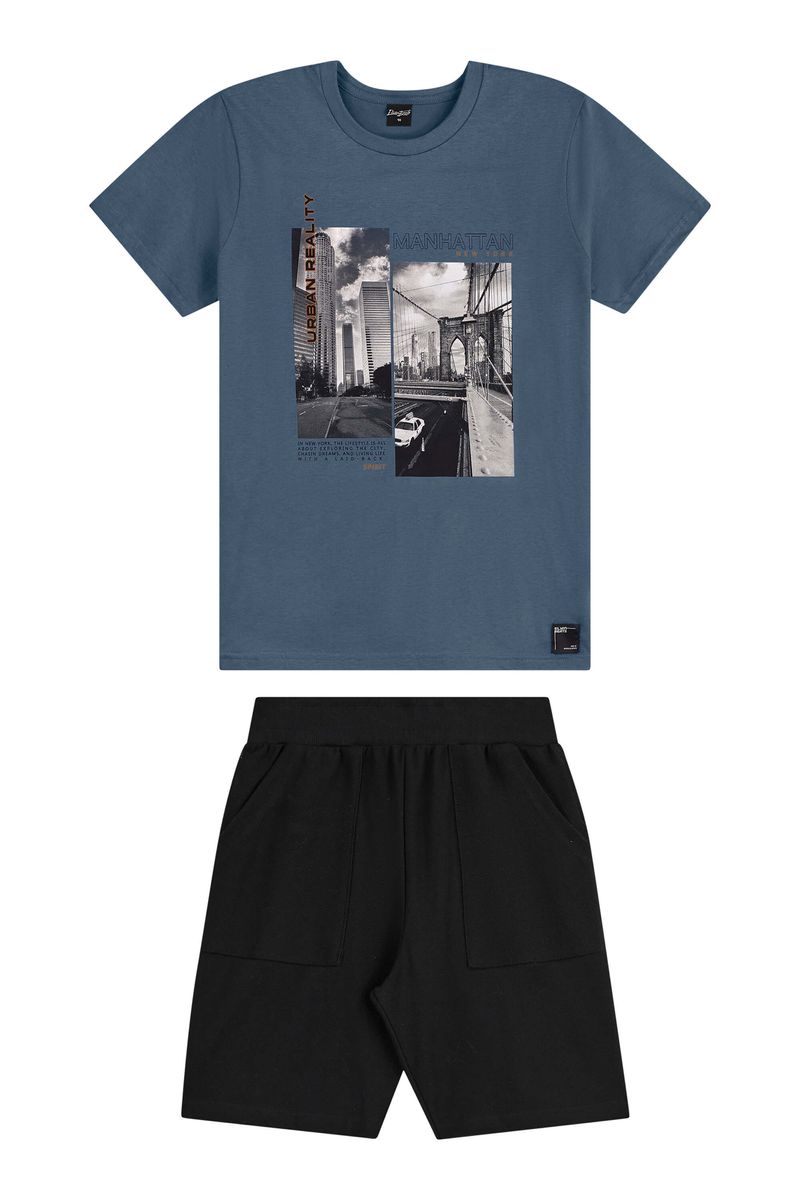 • Conjunto composto por camiseta e bermuda • Feito em meia malha e moletom sarjado • Possui mangas curtas • Possui estampa urbana • Elástico no cós • Possui bolsos • Ideal para dia a dia ou passeios