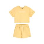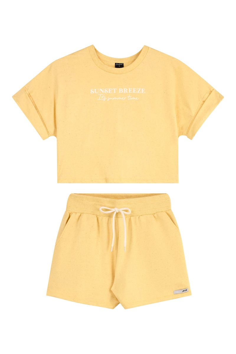 • Conjunto composto por blusa e short • Feito em malha de linho e moletom de linho • Possui comprimento cropped • Possui mangas curtas com dobra • Possui estampa frontal • Elástico no cós • Possui bolsos • Ideal para curtir dias de sol ou encontrar a galera