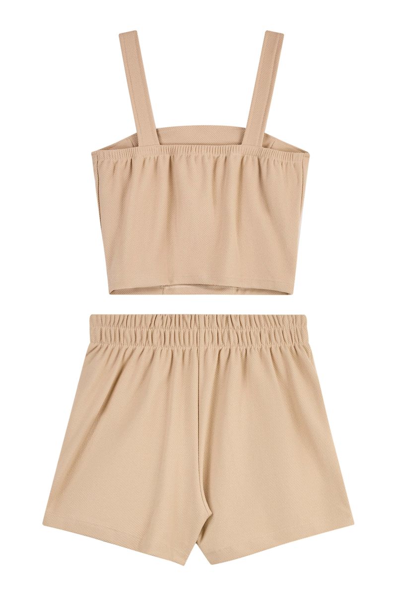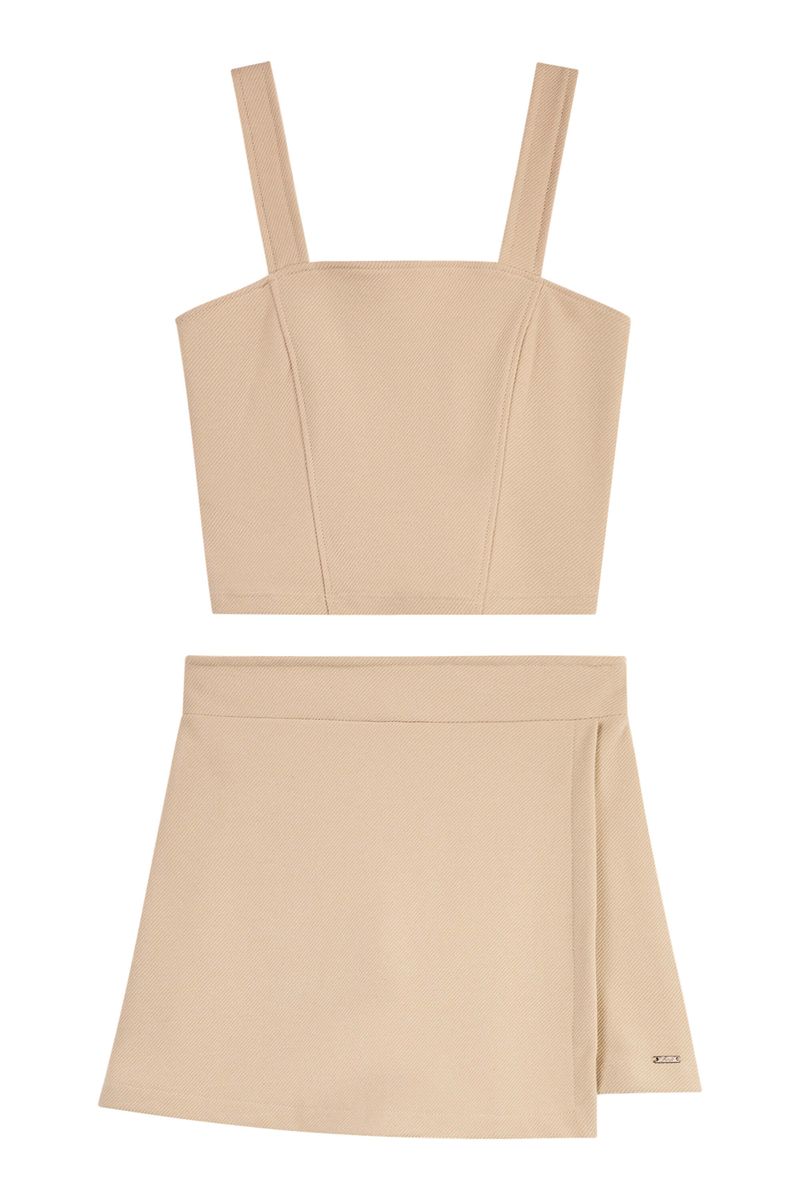 • Conjunto composto por regata e short saia • Feito em moletom sarjado • Possui comprimento curto • Possui alças • Elástico no cós • Possui transpasse frontal • Ideal para momentos de lazer, passeios e festas