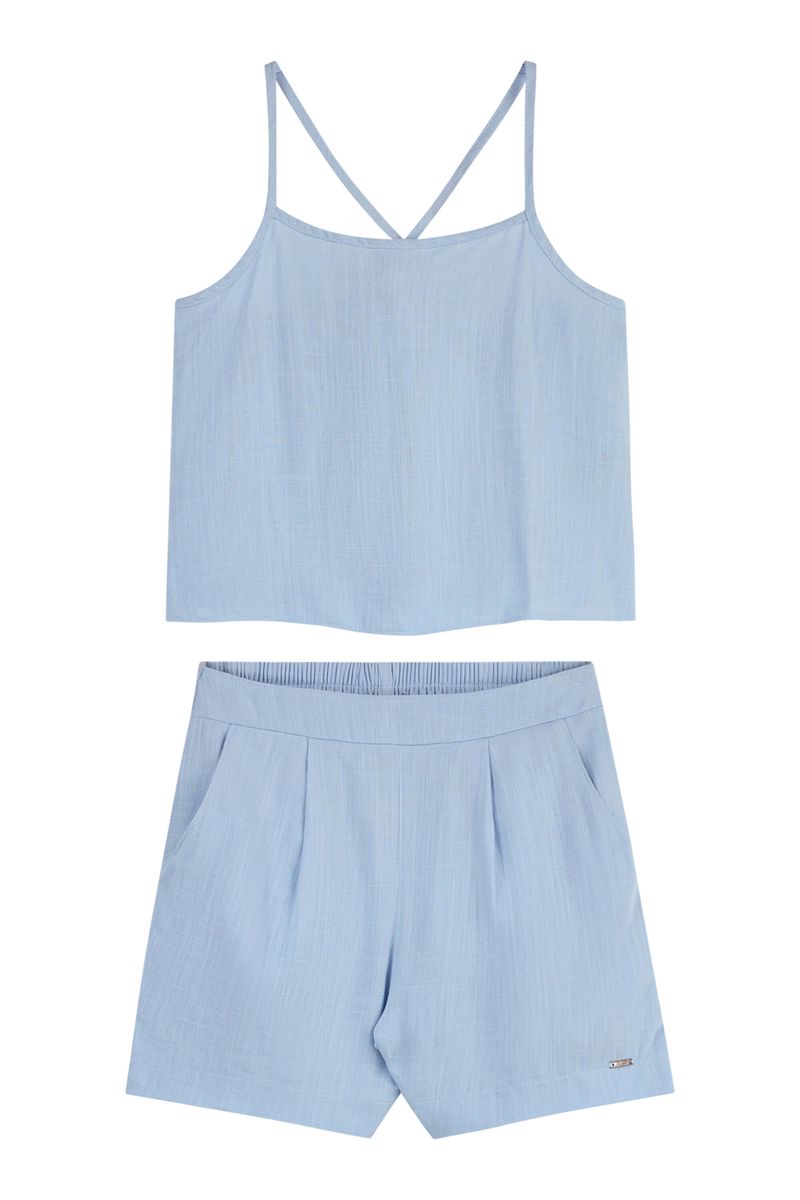 • Conjunto composto por regata e short • Feito em tecido de viscolinho • Possui comprimento cropped • Possui alças com transpasse e amarração • Elástico no cós • Possui bolsos • Possui forro • Ideal para passeios ou encontros com a galera