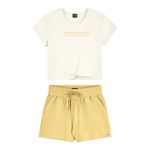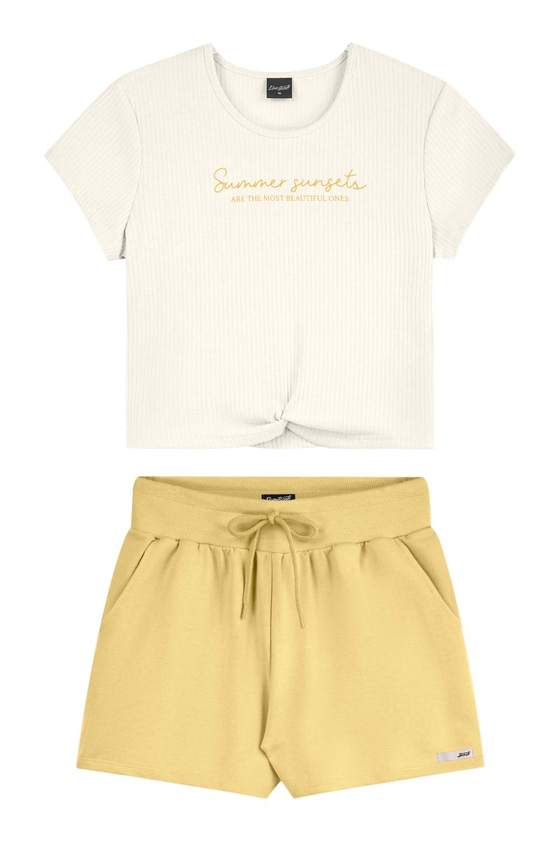 • Conjunto composto por blusa e short • Feito em malha canelada e moletom sem felpa • Possui comprimento cropped • Possui mangas curtas • Possui detalhe em nó • Elástico no cós • Possui bolsos • Ideal para curtir as férias, passeios e encontros com os amigos
