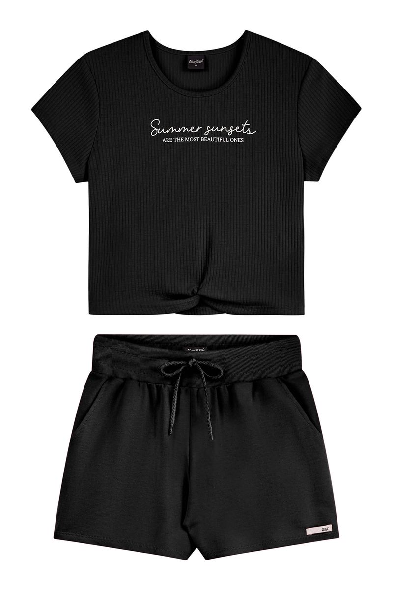 • Conjunto composto por blusa e short • Feito em malha canelada e moletom sem felpa • Possui comprimento cropped • Possui mangas curtas • Possui detalhe em nó • Elástico no cós • Possui bolsos • Ideal para curtir as férias, passeios e encontros com os amigos
