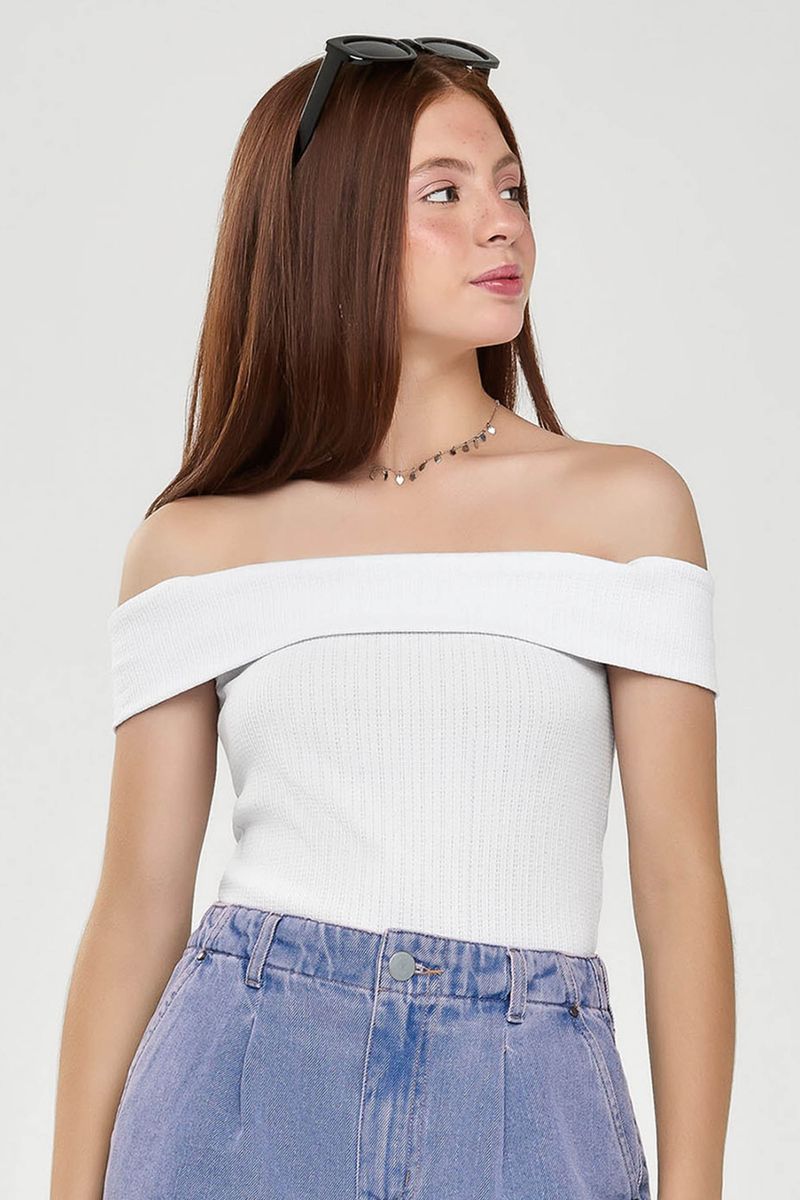 • Feita em malha canelada trabalhada • Possui comprimento cropped • Possui decote ombro a ombro • Ideal para passeios e festas
