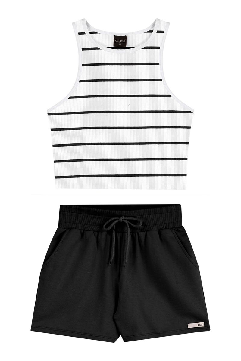 • Conjunto composto por regata e short • Feito em canelado listrado e moletom sem felpa • Possui comprimento curto • Possui modelagem ajustada • Possui elástico no cós • Possui bolsos laterais • Ideal para passeios e momentos de lazer