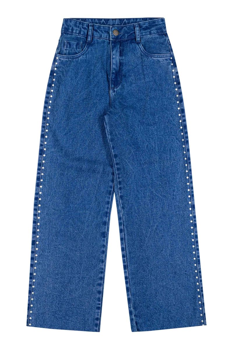 • Feita em jeans • Modelagem wide leg • Fechamento em botão e zíper • Possui bolsos • Com aplicações laterais em tachinhas • Ideal para passeios ou encontros com as amigas