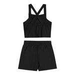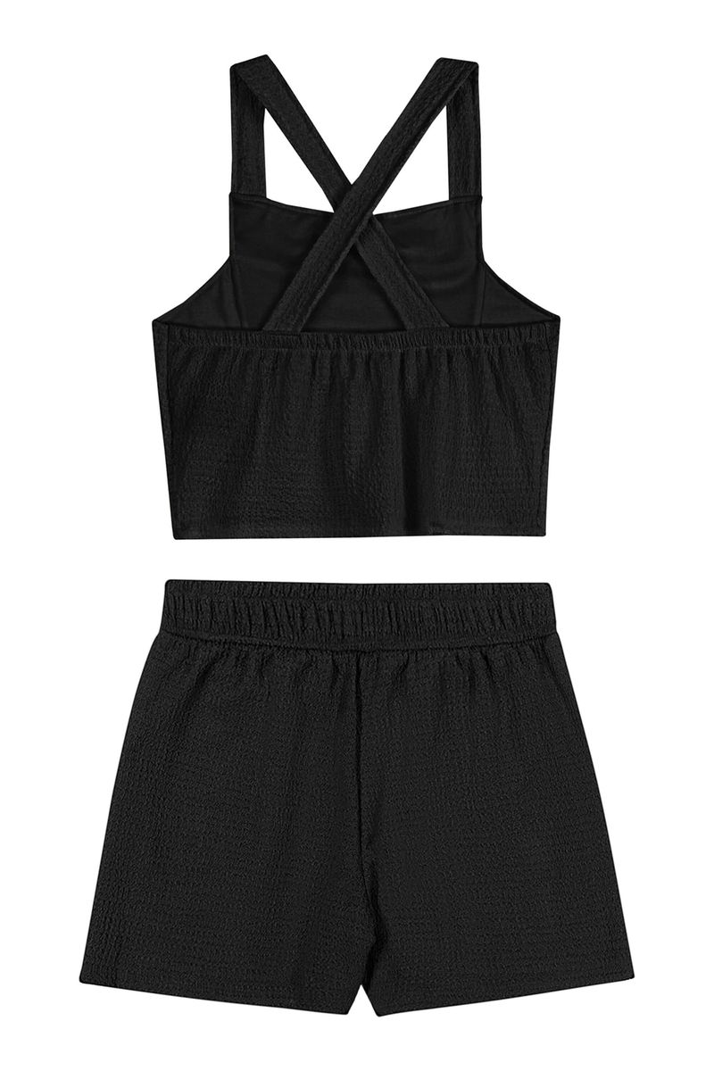 • Conjunto composto por regata e short • Feito em malha texturizada • Possui comprimento curto • Possui alças com transpasse nas costas • Elástico no cós • Possui forro • Ideal para eventos e momentos especiais