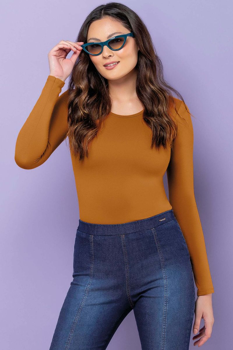 AdultoFemininoBlusas FemininoBlusa Feminina Manga Longa Básica Marialícia Marrom