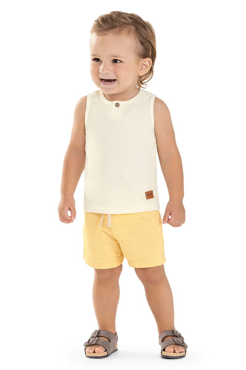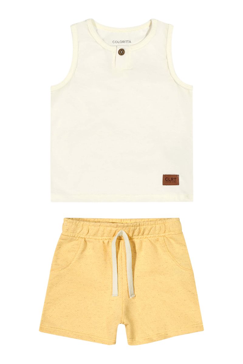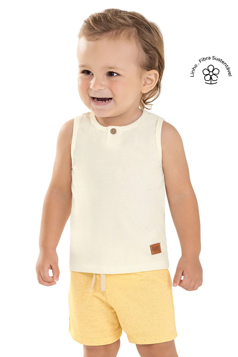 • Conjunto composto por regata e bermuda • Feito em meia malha e moletom eco linho • Possui peitilho com um botão • Elástico no cós • Ideal para passeios