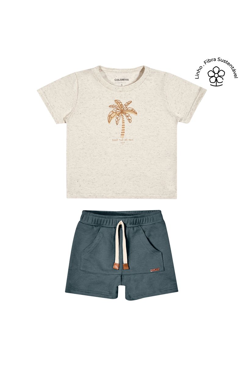 • Conjunto composto por camiseta e bermuda • Feito em malha linho e moletinho • Possui mangas curtas • Estampa de palmeira com efeito puff • Elástico no cós • Possui bolso • Ideal para momentos descontraídos e passeios