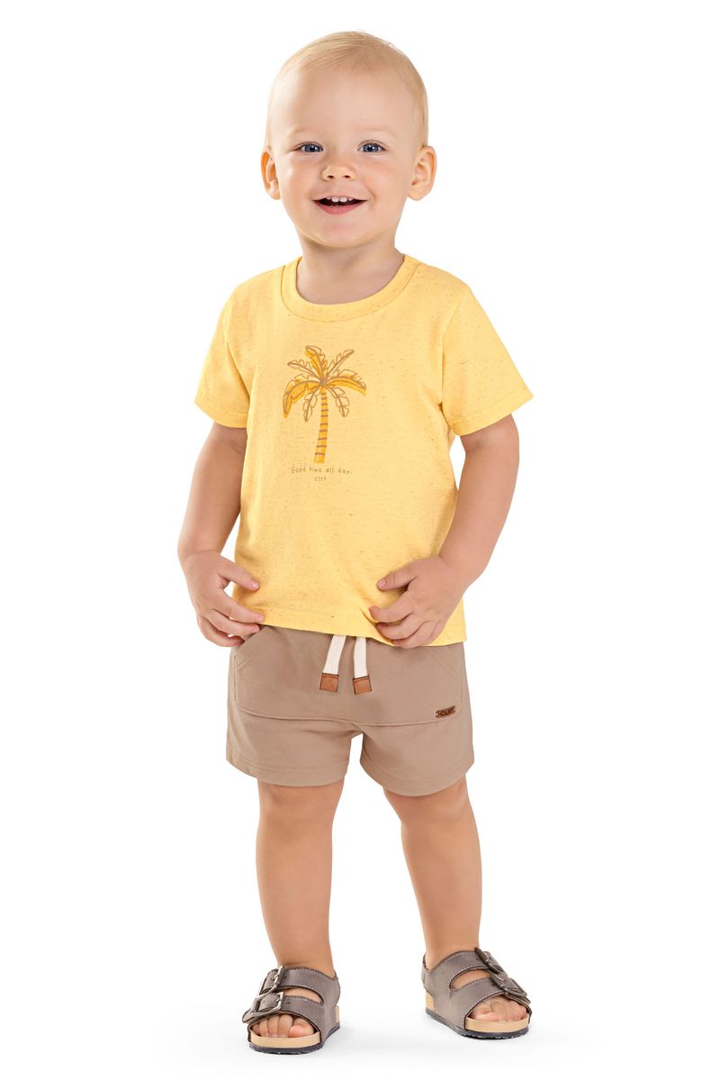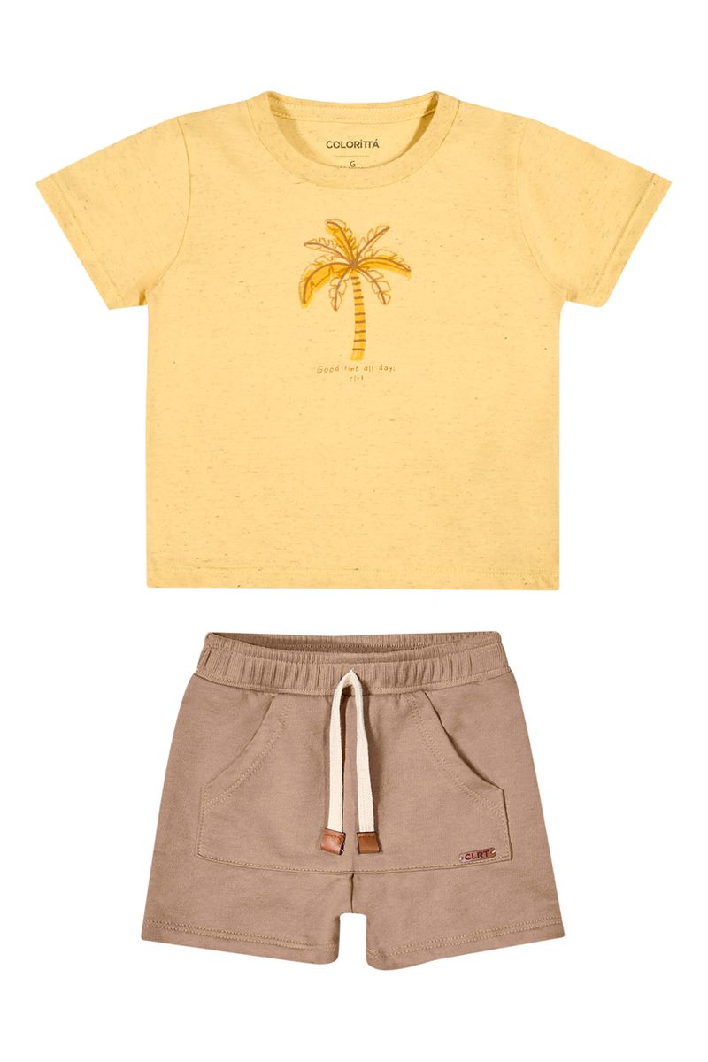 • Conjunto composto por camiseta e bermuda • Feito em malha linho e moletinho • Possui mangas curtas • Estampa de palmeira com efeito puff • Elástico no cós • Possui bolso • Ideal para momentos descontraídos e passeios