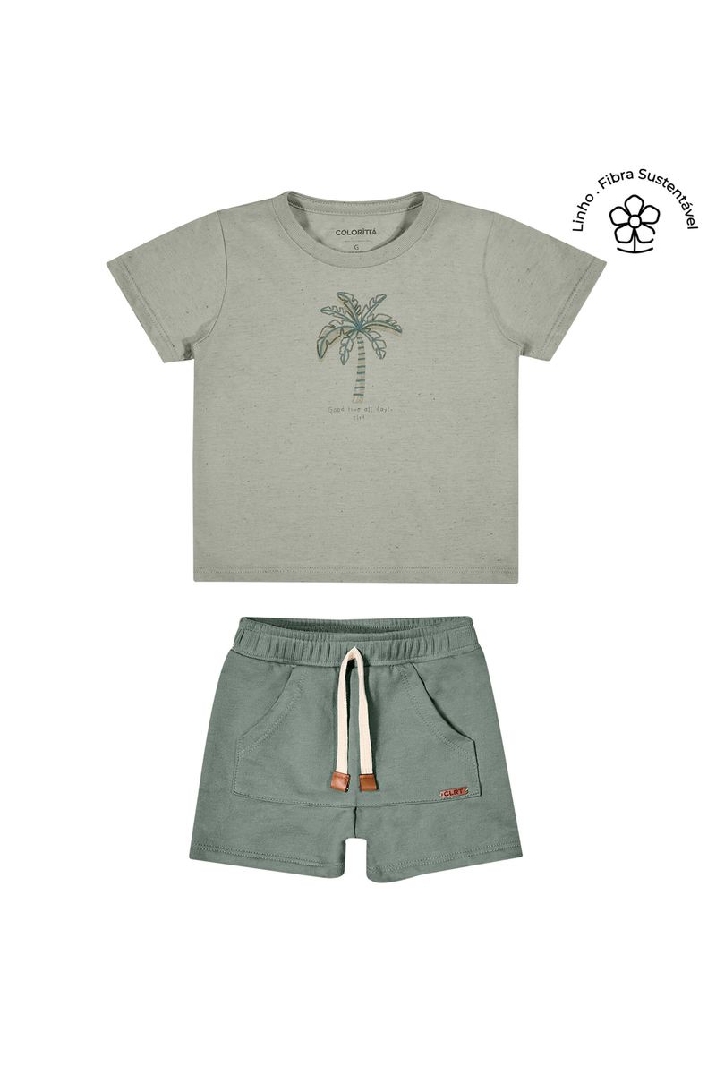 • Conjunto composto por camiseta e bermuda • Feito em malha linho e moletinho • Possui mangas curtas • Estampa de palmeira com efeito puff • Elástico no cós • Possui bolso • Ideal para momentos descontraídos e passeios