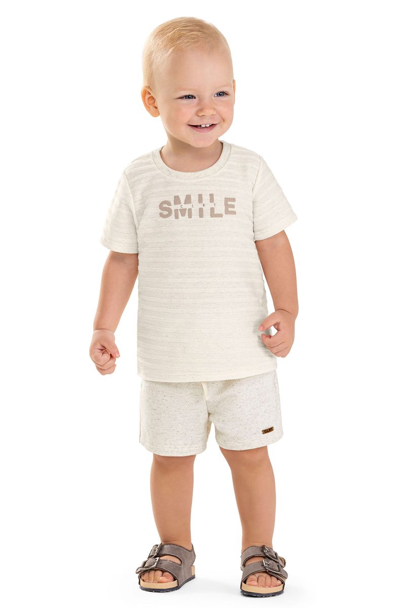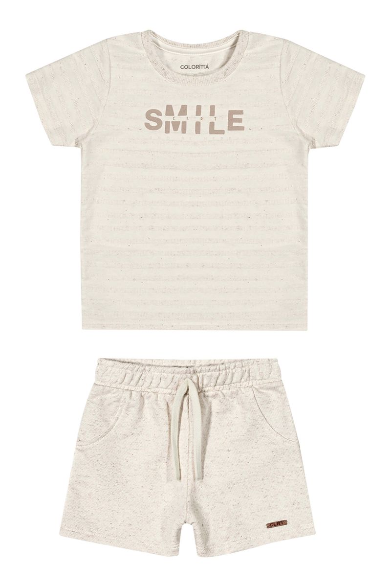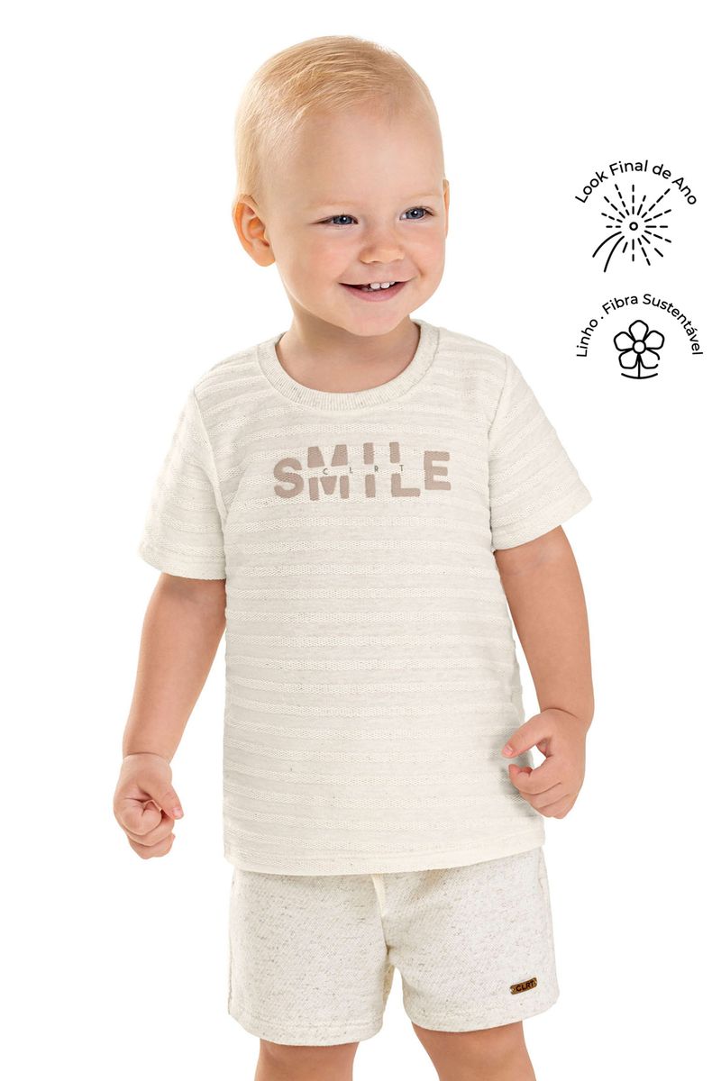 • Conjunto composto por camiseta e bermuda • Feito em malha linho listrada e moletom eco linho • Possui mangas curtas • Possui estampa com efeito puff • Elástico no cós • Ideal para momentos especiais