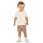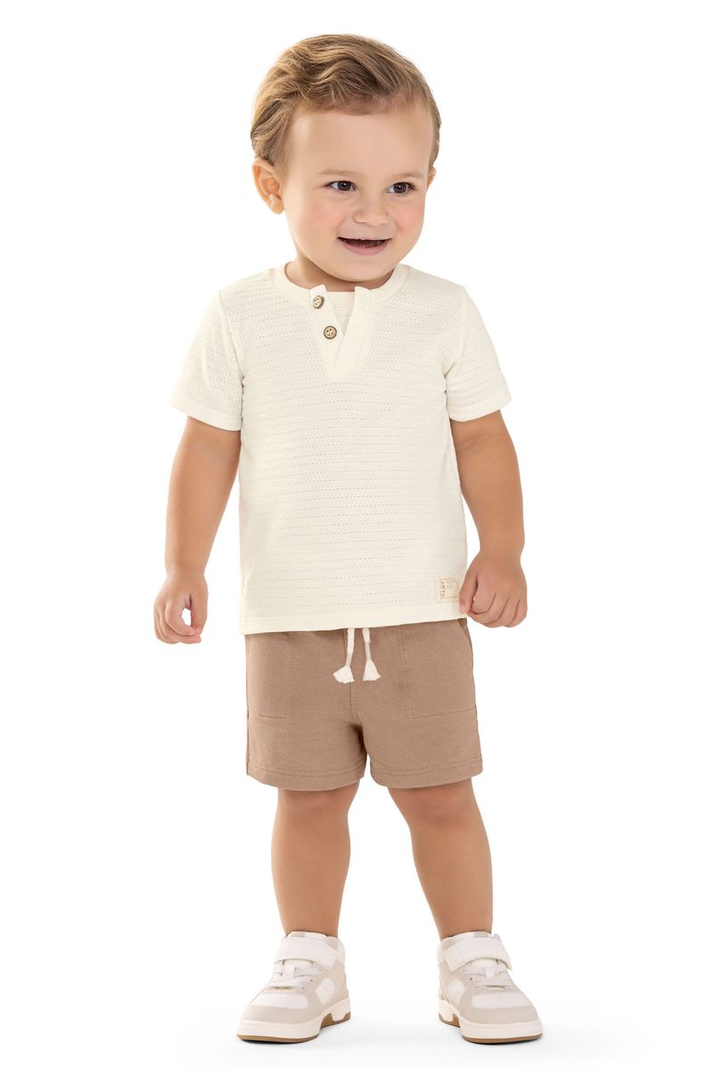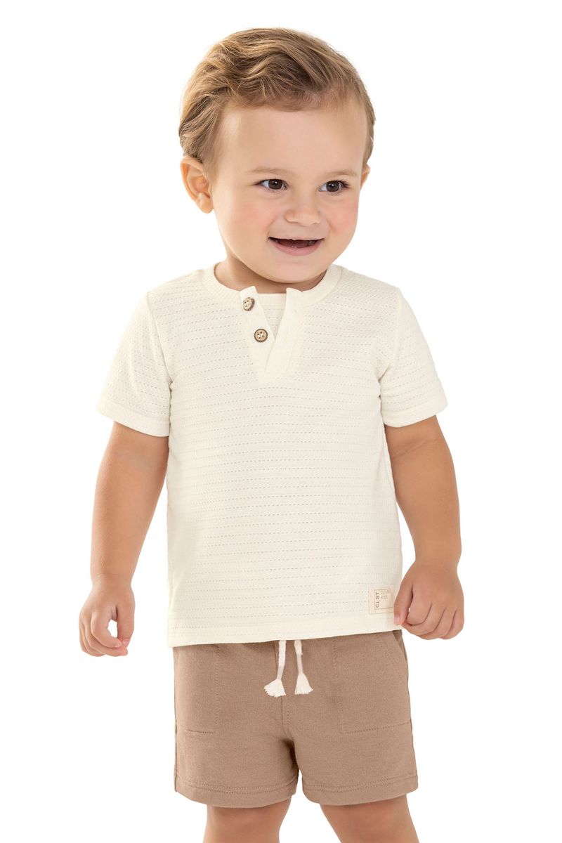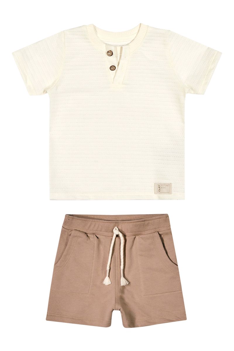 • Conjunto composto por camiseta e bermuda • Feito em malha texturizada e moletinho • Possui mangas curtas • Recorte em V no peitilho com sobreposição e botões • Elástico no cós • Possui bolsos • Ideal para ocasiões casuais e passeios em família