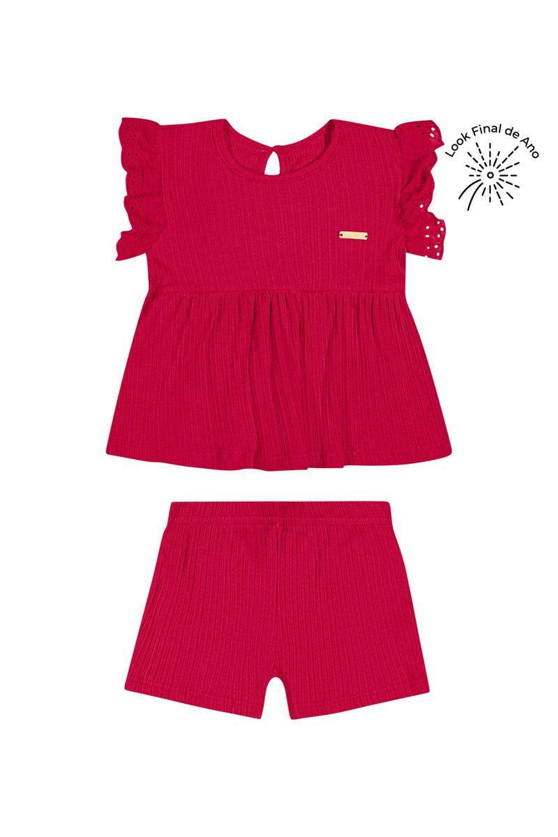 • Conjunto composto por blusa e short • Feito em malha canelada trabalhada • Mangas curtas com babados em bordado vazado • Fechamento em botão nas costas • Elástico no cós • Ideal para momentos especiais