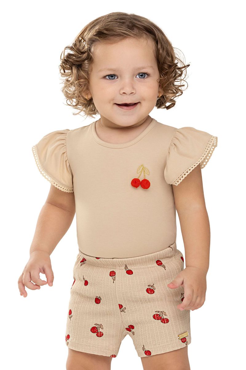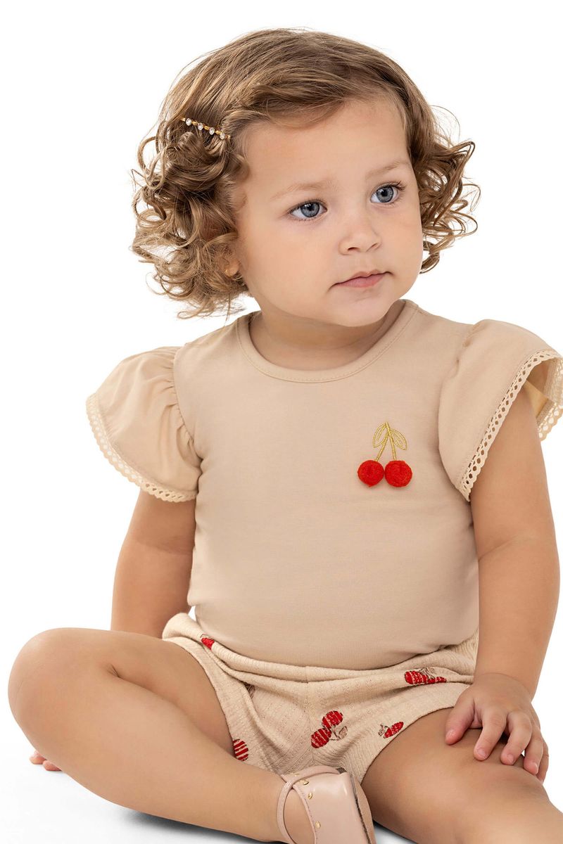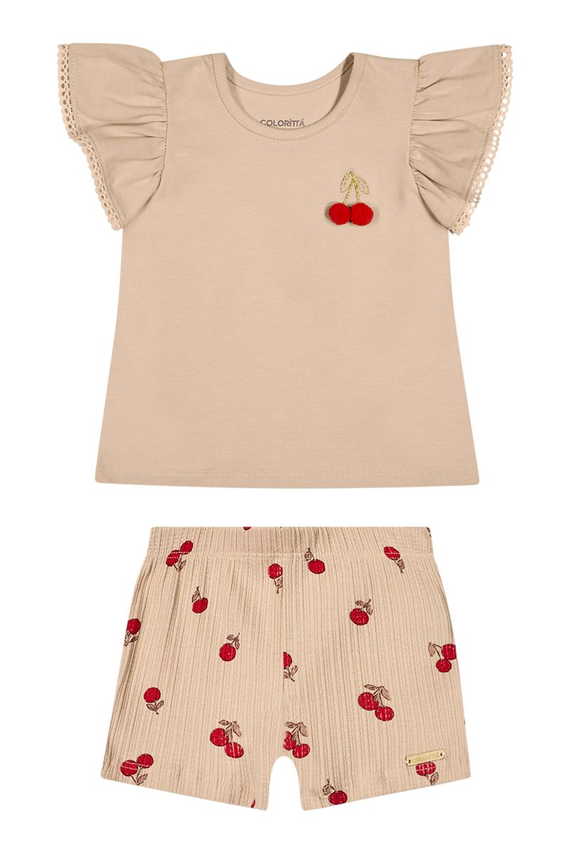 • Conjunto composto por blusa e short • Feito em cotton leve e malha canelada trabalhada • Mangas curtas franzidas com renda • Estampa de cerejas com aplique de pompom • Elástico no cós • Ideal para passeios em família e momentos especiais