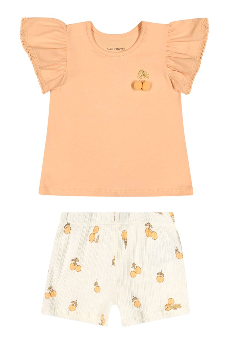 • Conjunto composto por blusa e short • Feito em cotton leve e malha canelada trabalhada • Mangas curtas franzidas com renda • Estampa de cerejas com aplique de pompom • Elástico no cós • Ideal para passeios em família e momentos especiais