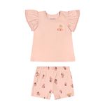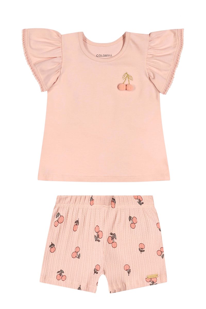 • Conjunto composto por blusa e short • Feito em cotton leve e malha canelada trabalhada • Mangas curtas franzidas com renda • Estampa de cerejas com aplique de pompom • Elástico no cós • Ideal para passeios em família e momentos especiais