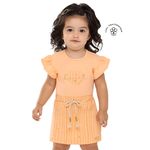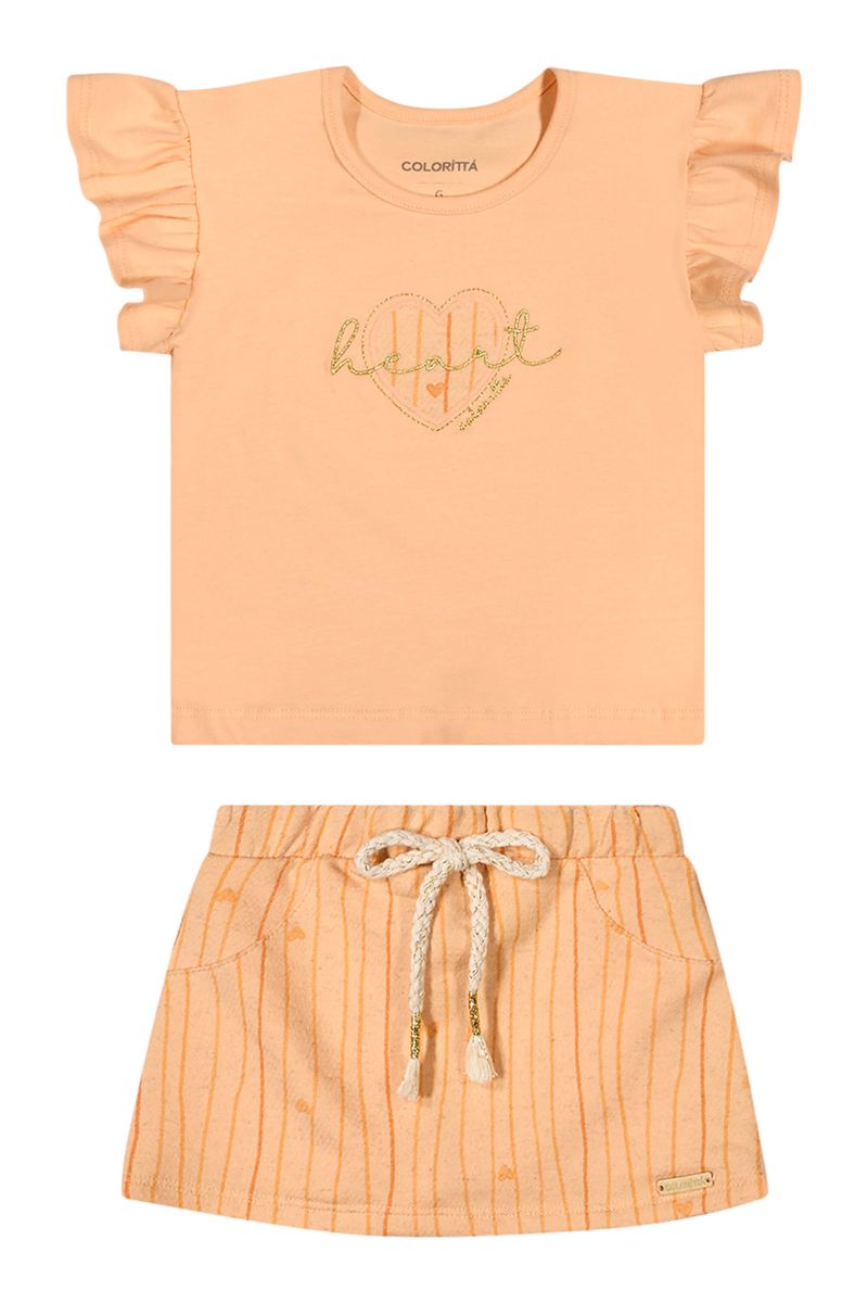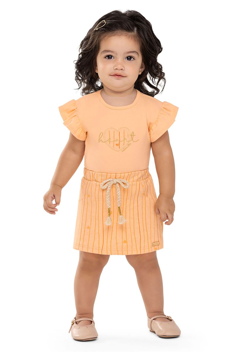 • Conjunto composto por blusa e saia • Feito em cotton leve e moletom eco linho • Mangas curtas franzidas • Possui bordado de coração com fio lurex • Elástico no cós • Estampa listrada com pequenos corações • Possui short interno • Ideal para almoços em família