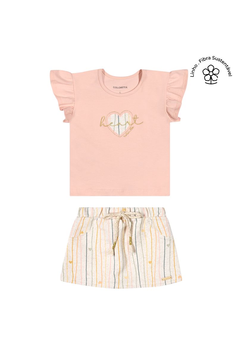 • Conjunto composto por blusa e saia • Feito em cotton leve e moletom eco linho • Mangas curtas franzidas • Possui bordado de coração com fio lurex • Elástico no cós • Estampa listrada com pequenos corações • Possui short interno • Ideal para almoços em família