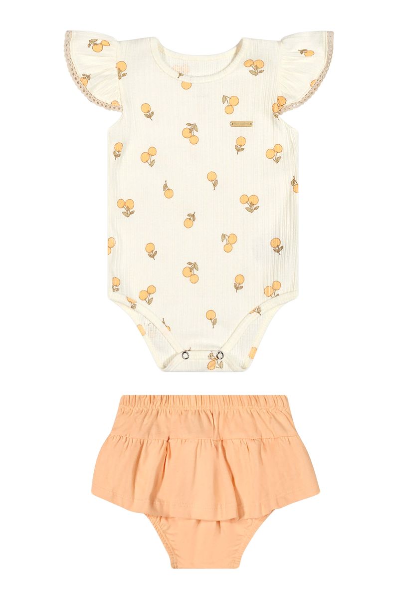 • Conjunto composto por body e calcinha • Feito em malha canelada trabalhada e cotton leve • Mangas curtas franzidas com renda • Fechamento em botões de pressão • Estampa de cereja • Elástico no cós e na boca das pernas • Ideal para os primeiros passeios