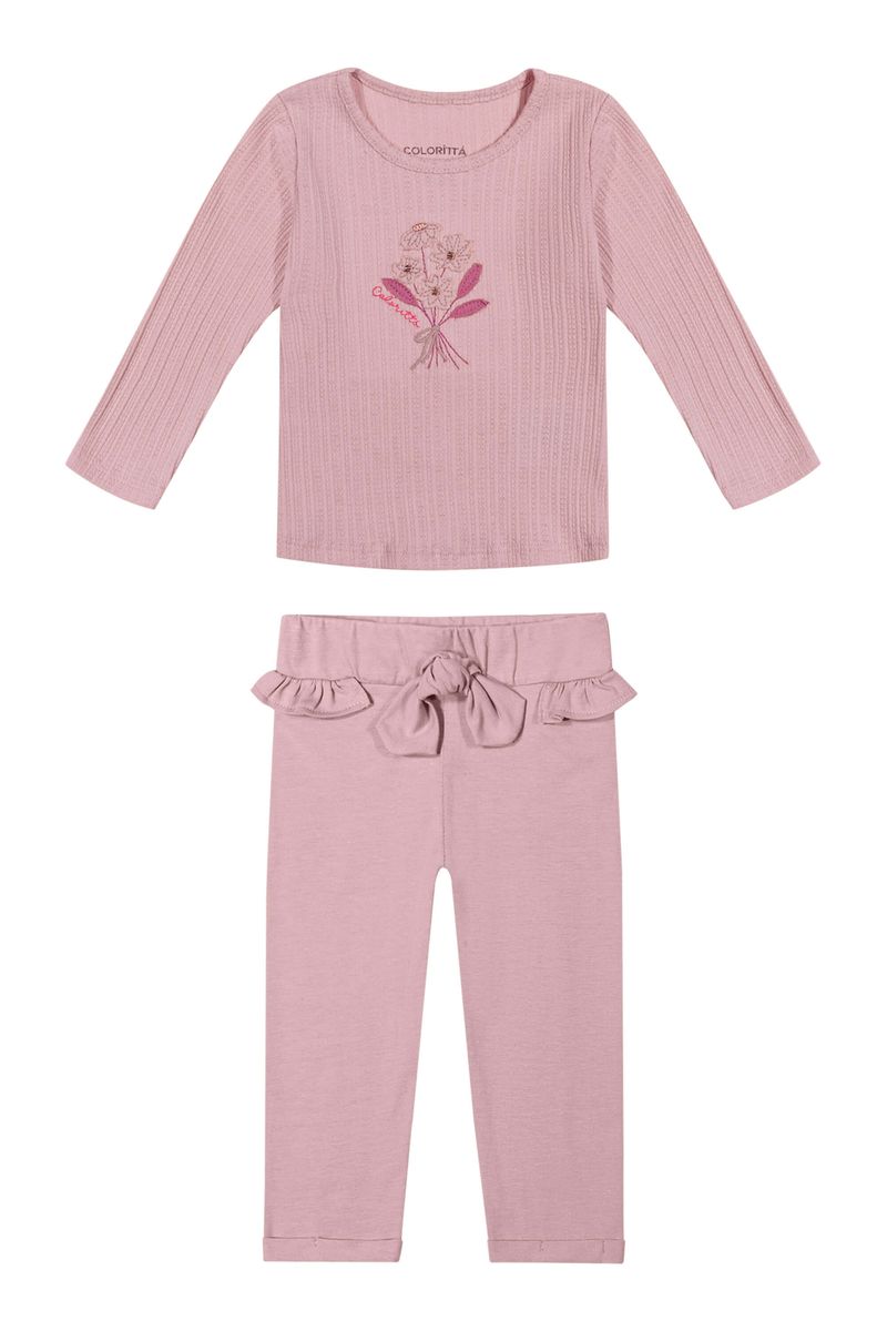 • Conjunto composto por blusa e calça legging • Feito em malha tricô texturizada e cotton leve • Possui mangas longas • Bordado floral com brilho • Elástico no cós • Detalhe em babado com laço • Ideal para momentos especiais em família