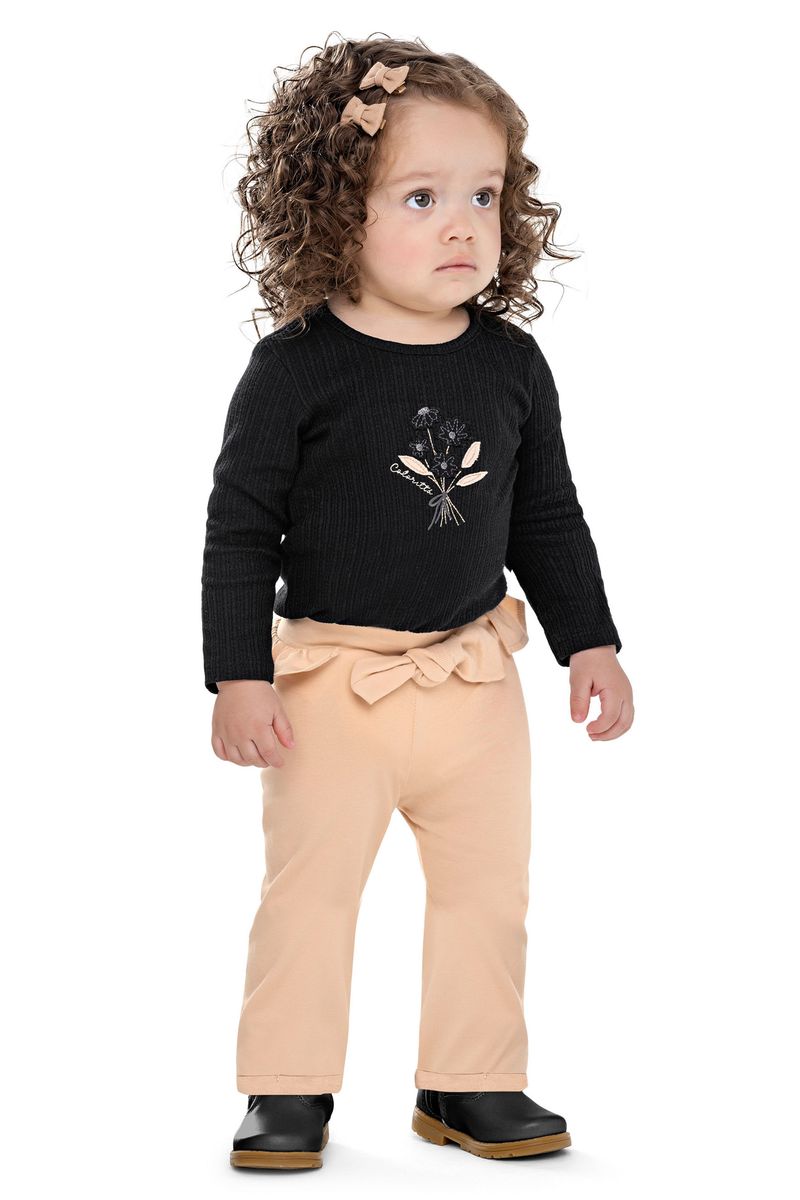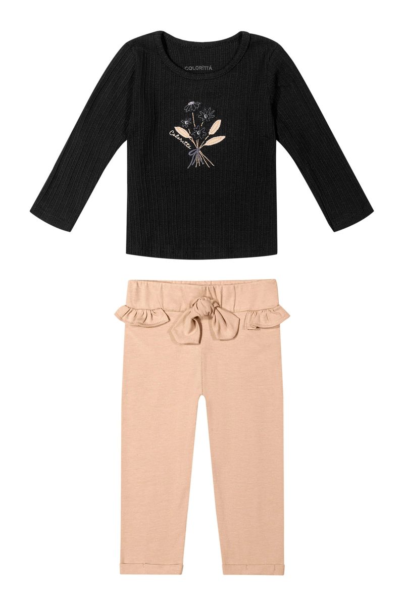 • Conjunto composto por blusa e calça legging • Feito em malha tricô texturizada e cotton leve • Possui mangas longas • Bordado floral com brilho • Elástico no cós • Detalhe em babado com laço • Ideal para momentos especiais em família