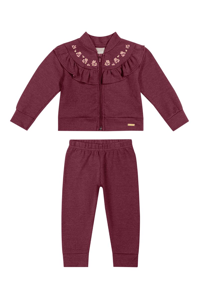 • Conjunto composto por jaqueta e calça • Feito em molecotton canelado sem felpa • Possui mangas longas • Abertura frontal em zíper • Detalhe em babados • Estampa floral com efeito puff • Elástico no cós • Ideal para momentos especiais ou passeios