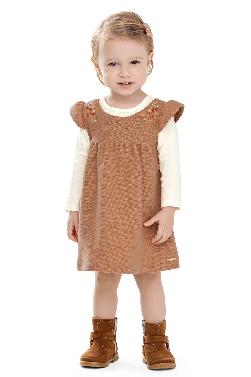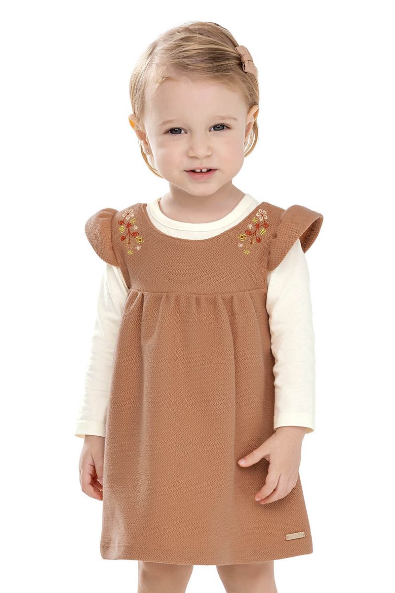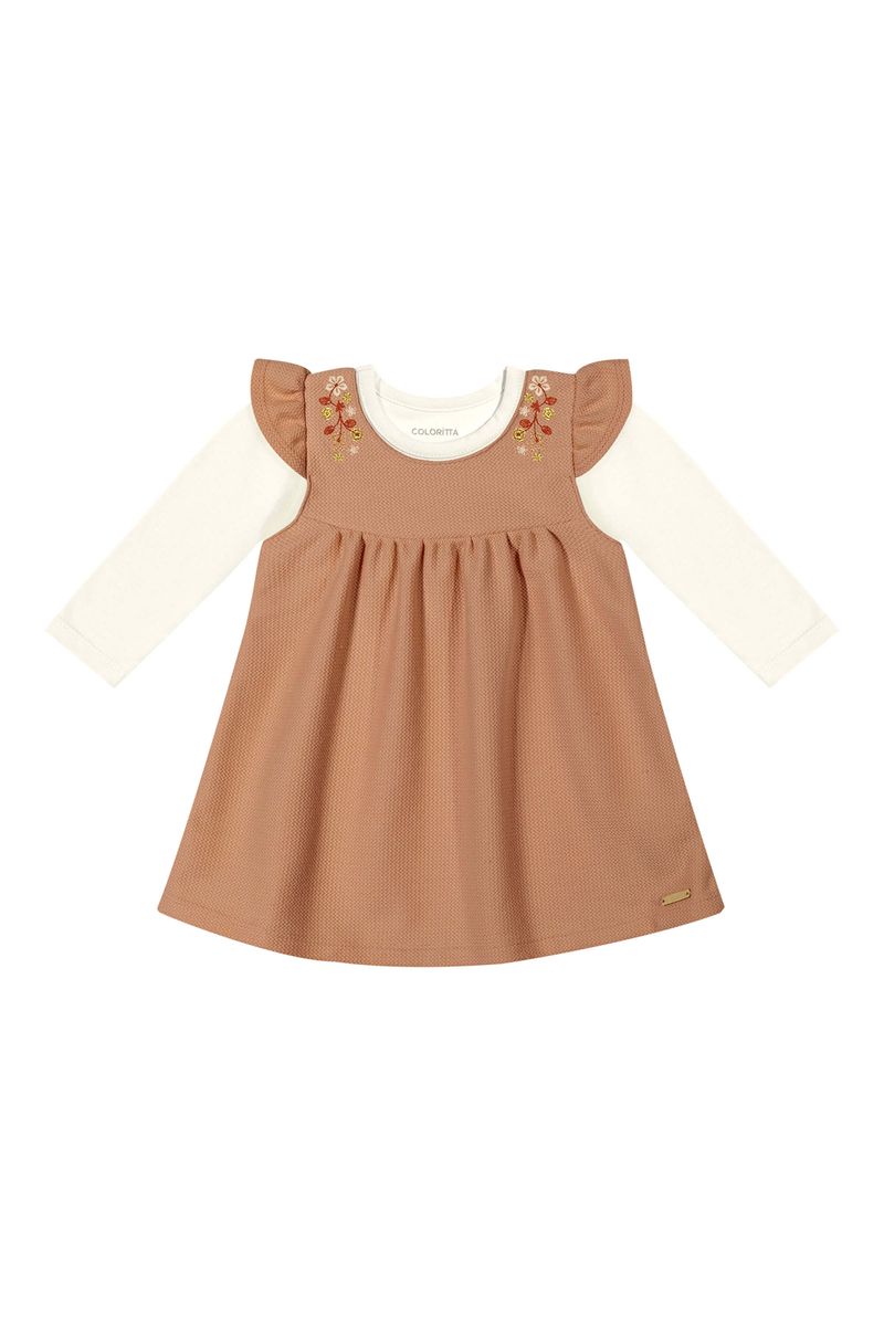 • Conjunto composto por blusa e vestido • Feito em cotton leve e moletom jacquard sem felpa • Blusa com mangas longas • Vestido com babados nas mangas • Bordado floral com fio lurex • Ideal para eventos especiais