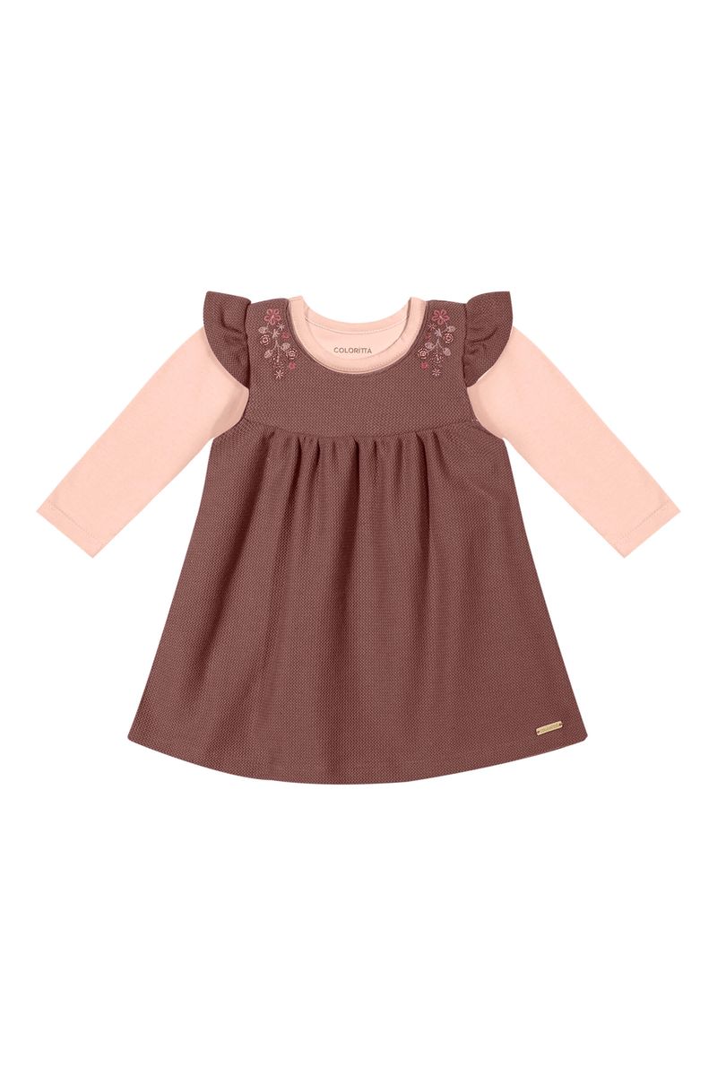 • Conjunto composto por blusa e vestido • Feito em cotton leve e moletom jacquard sem felpa • Blusa com mangas longas • Vestido com babados nas mangas • Bordado floral com fio lurex • Ideal para eventos especiais