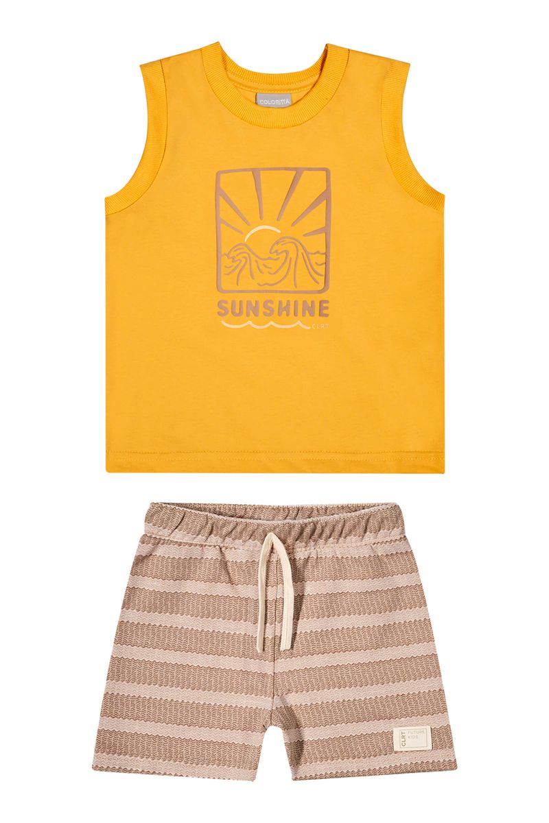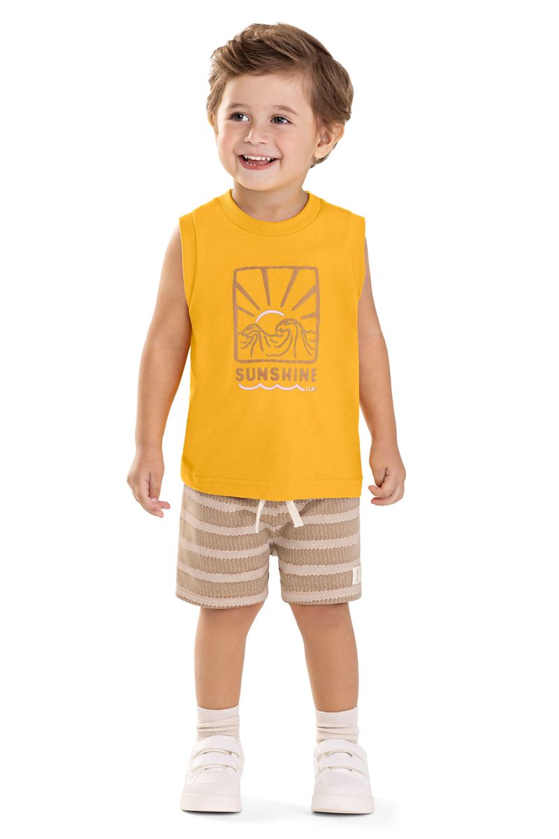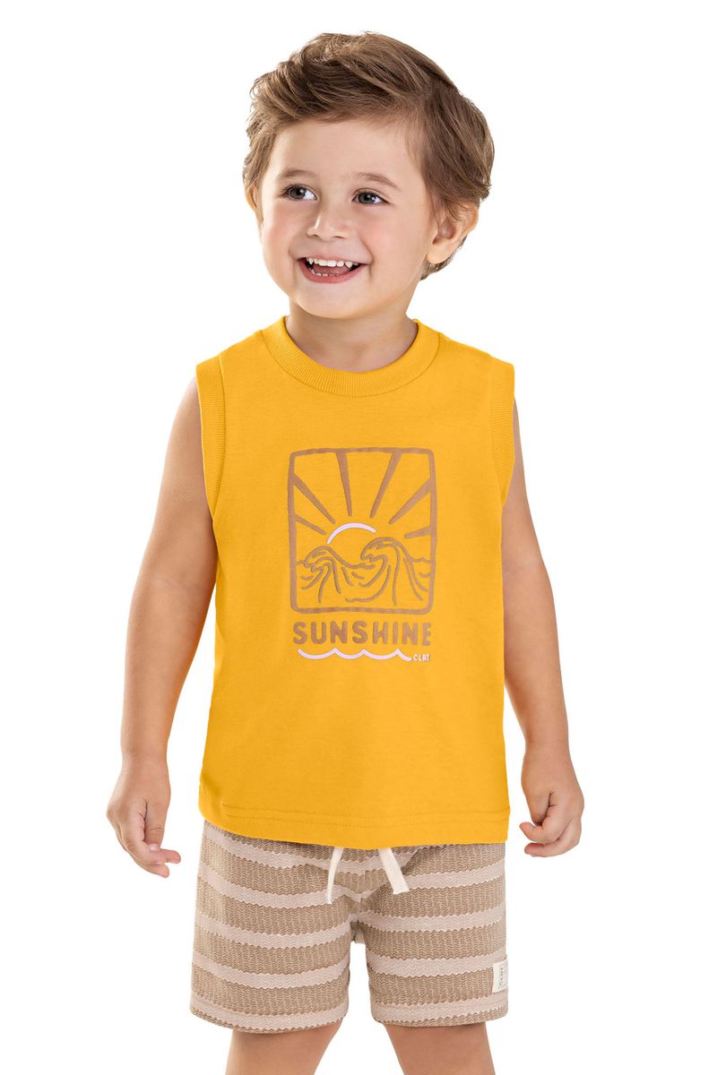 • Conjunto composto por regata e bermuda • Feito em meia malha e moletinho estampado • Estampa com temática tropical • Possui detalhes em relevo • Elástico no cós • Ideal para passeios em dias de sol