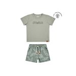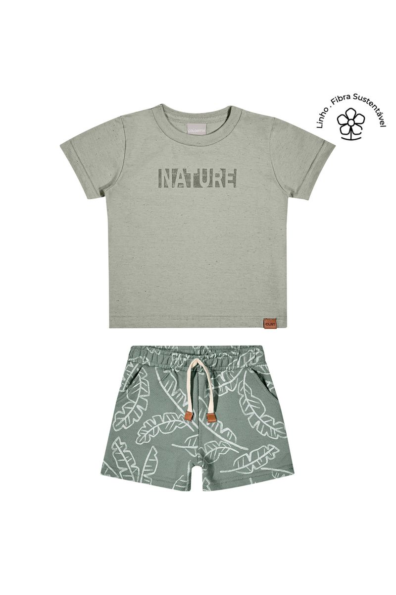 • Conjunto composto por camiseta e bermuda • Feito em malha linho e moletom eco linho estampado • Possui mangas curtas • Estampa tropical com folhas • Detalhes aveludados • Elástico no cós • Possui bolsos • Ideal para passeios e momentos de lazer