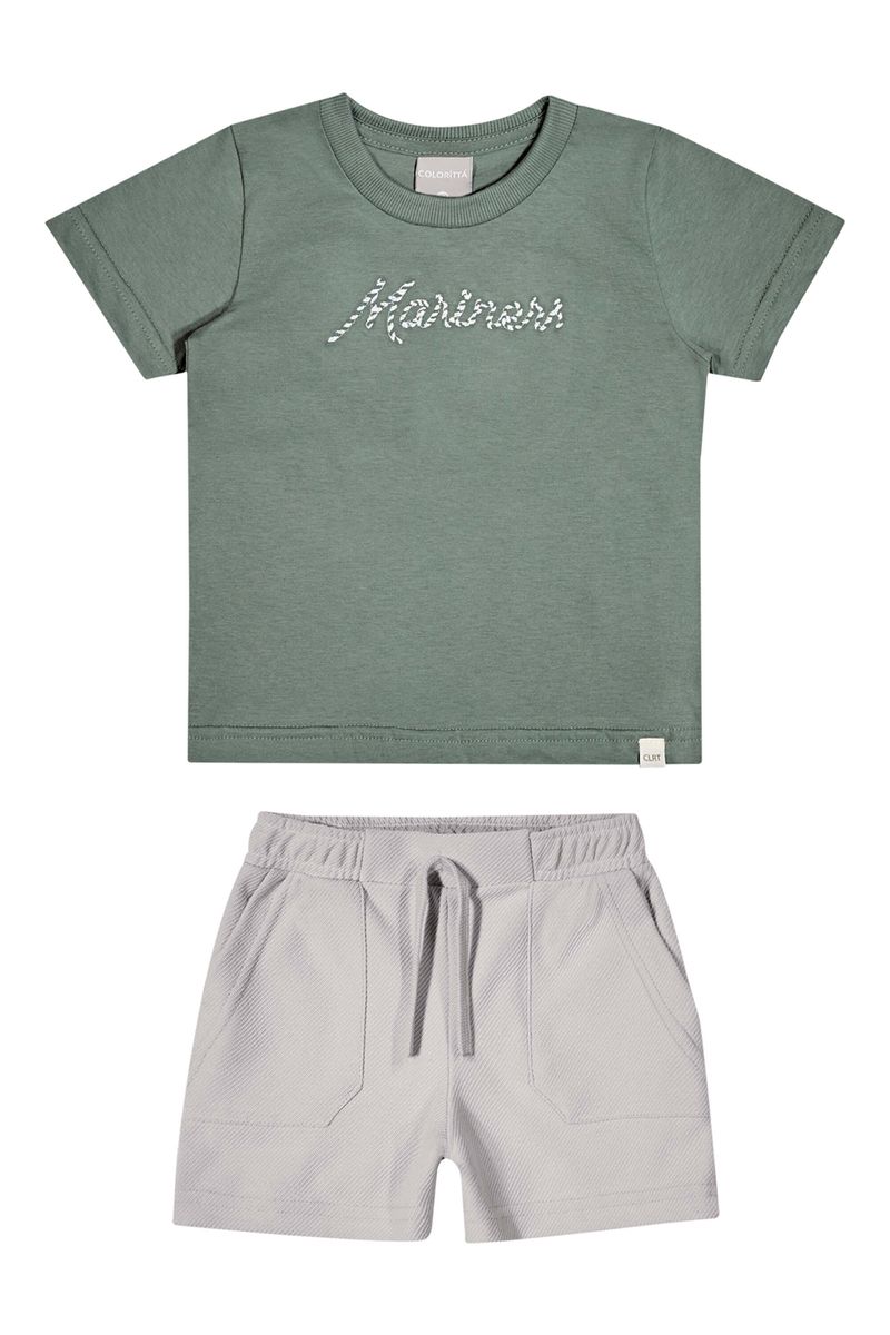 • Conjunto composto por camiseta e bermuda • Feito em meia malha e moletom sarjado • Possui mangas curtas • Possui bordado bicolor • Elástico no cós • Possui bolsos • Ideal para passeios e momentos de lazer