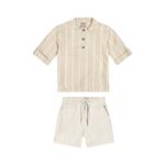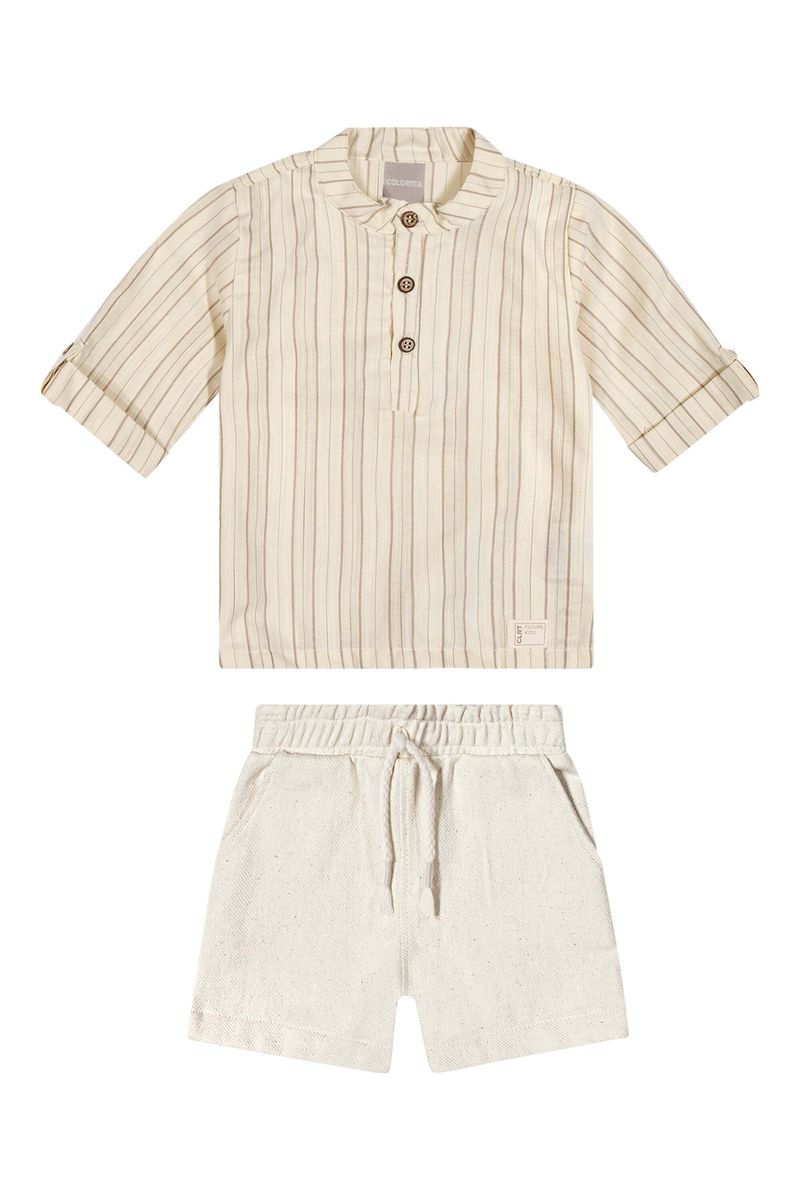 • Conjunto composto por camisa e bermuda • Feito em tecido listrado fio tinto e tecido eco jeans • Possui mangas 3/4 • Possui gola padre com abertura em botões no peitilho • Elástico no cós • Possui bolsos • Ideal para ocasiões especiais e celebrações