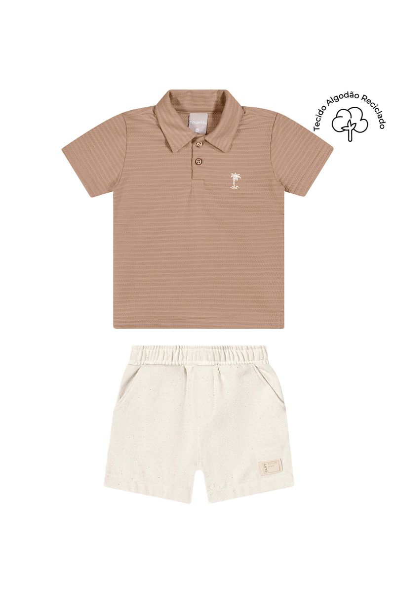 • Conjunto composto por camisa polo e bermuda • Feito em malha texturizada e tecido eco jeans • Possui mangas curtas • Abertura em botões no peitilho • Estampa tropical de palmeira em puff • Elástico no cós • Possui bolsos • Ideal para momentos de descontração