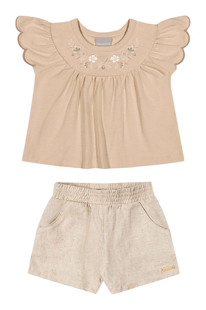 Conjunto Infantil Menina Bordado Flores Colorittá Bege REF: 73274-2039
