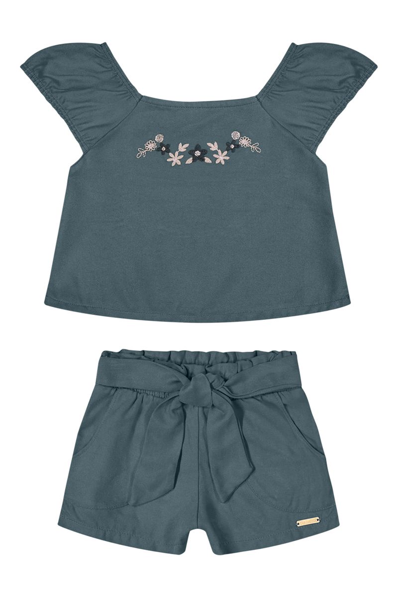 • Conjunto composto por blusa e short • Feito em tecido viscose sarjada • Mangas curtas camponesas • Possui bordado floral • Elástico no cós • Possui detalhe em amarração e bolsos • Ideal para passeios e encontros em família