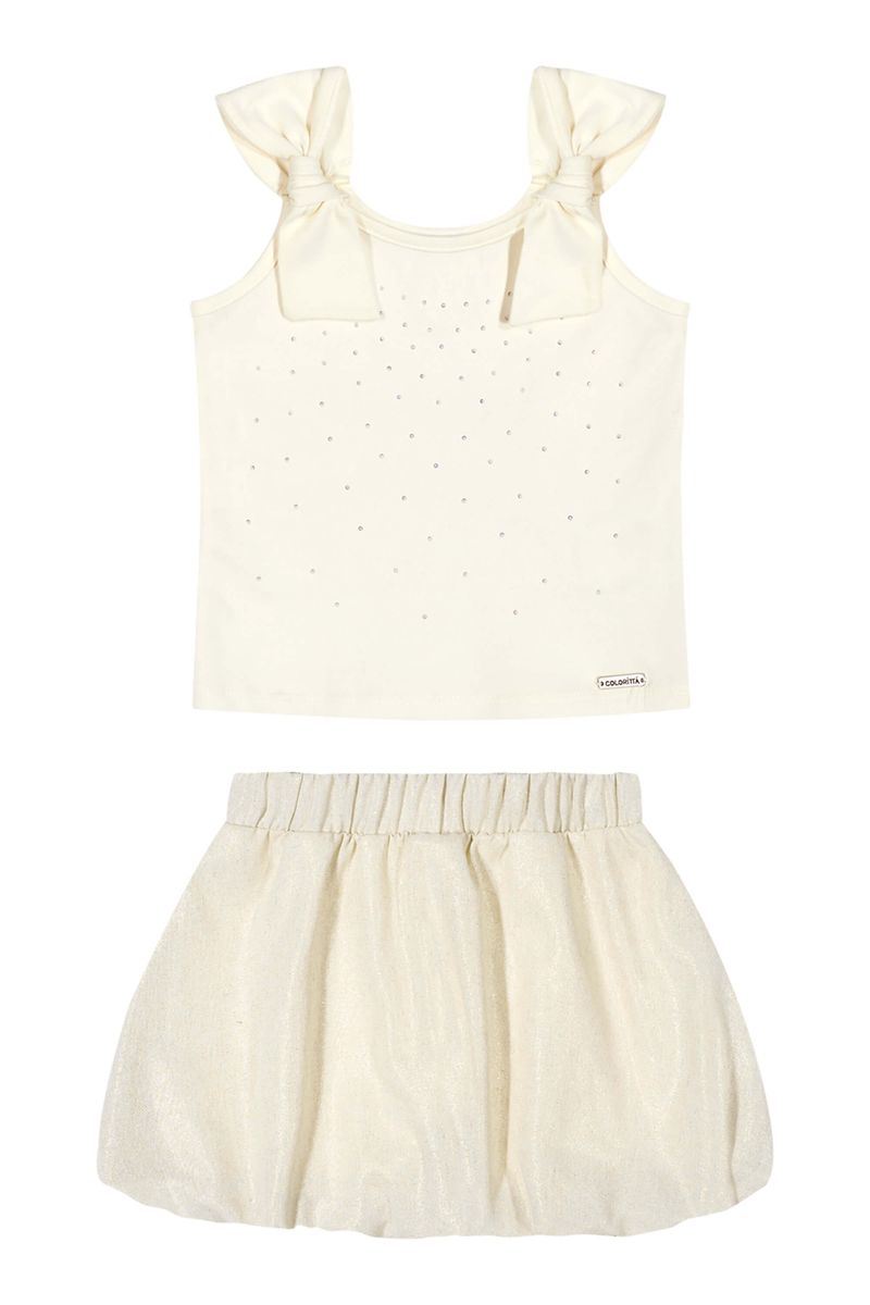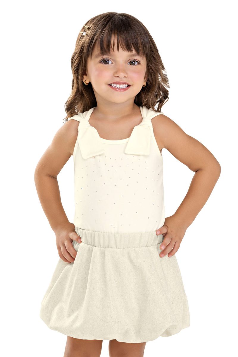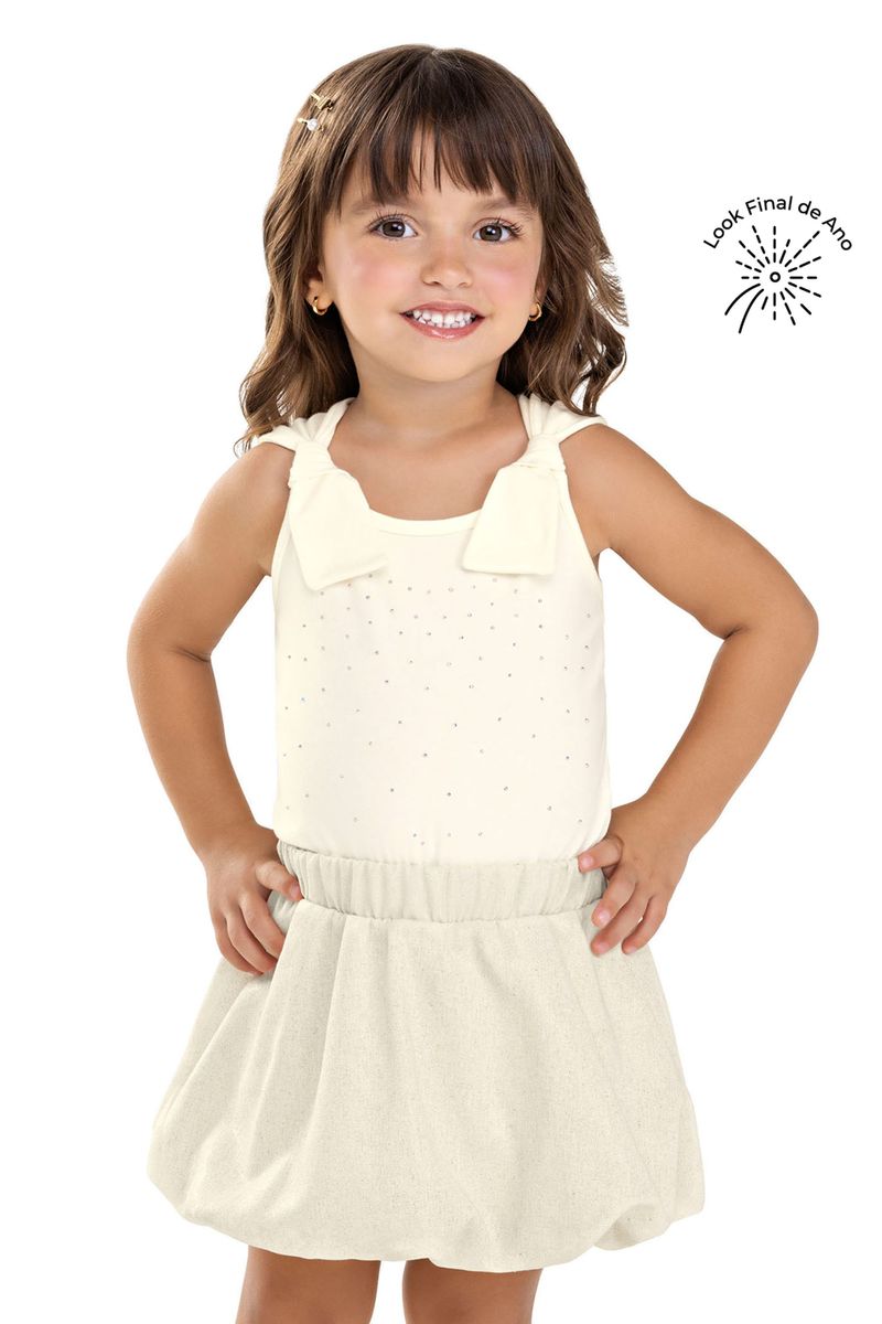 • Conjunto composto por regata e saia • Feito em cotton leve e tecido linho foil • Possui alças com laços • Detalhes em strass • Saia balonê com elástico no cós • Possui short interno • Possui acabamento cintilante • Ideal para ocasiões especiais
