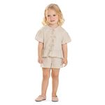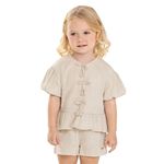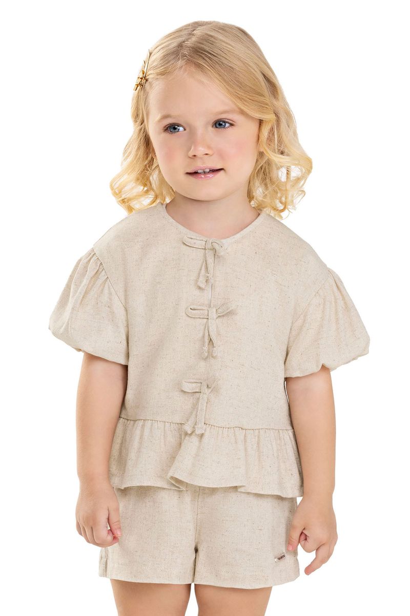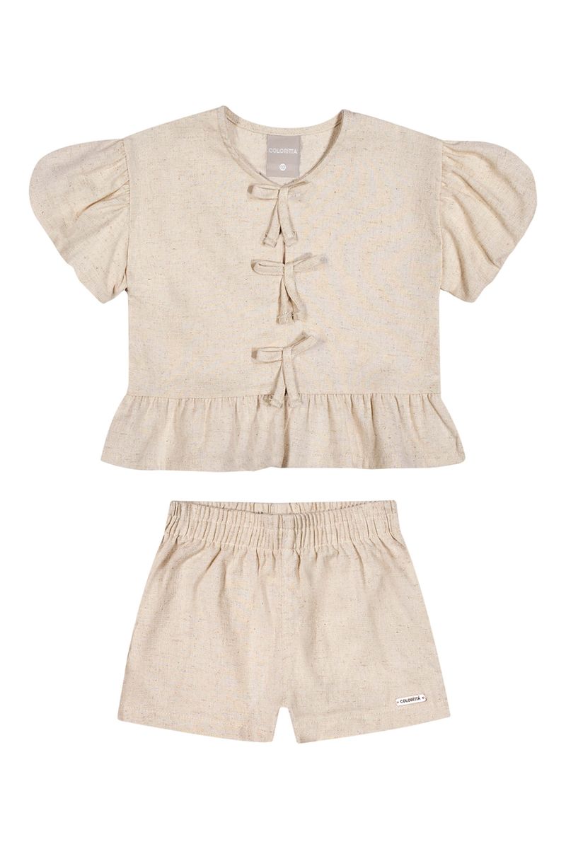• Conjunto composto por blusa e short • Feito em tecido linho rústico • Possui mangas curtas balonê • Detalhe frontal com laços e fechamento em botões • Elástico no cós • Ideal para passeios ao ar livre