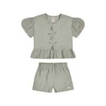 • Conjunto composto por blusa e short • Feito em tecido linho rústico • Possui mangas curtas balonê • Detalhe frontal com laços e fechamento em botões • Elástico no cós • Ideal para passeios ao ar livre