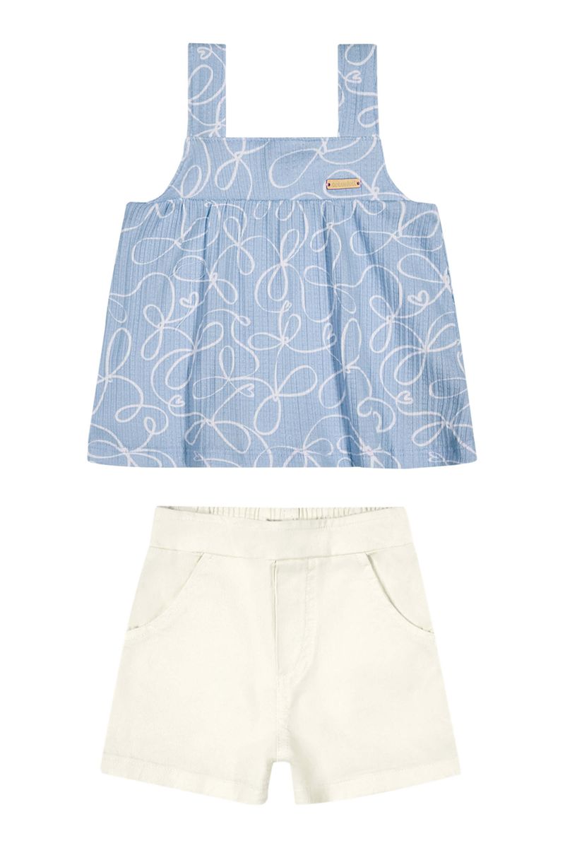 • Conjunto composto por regata e short • Feito em malha canelada trabalhada e sarja com elastano • Modelagem soltinha • Estampa de laços desenhados • Elástico no cós • Possui bolsos • Ideal para passeios em família, festinhas e momentos especiais