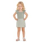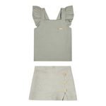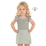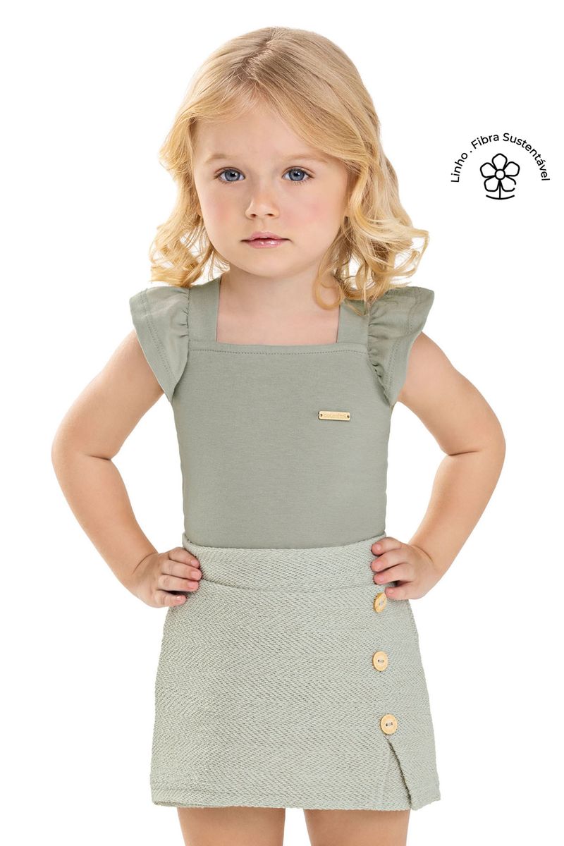 • Conjunto composto por blusa e short saia • Feito em cotton leve e malha tricô linho • Possui alças com babados • Transpasse nas costas com detalhe em laço • Elástico no cós • Detalhe em recorte com botões decorativos • Ideal para passeios e festas em família