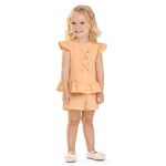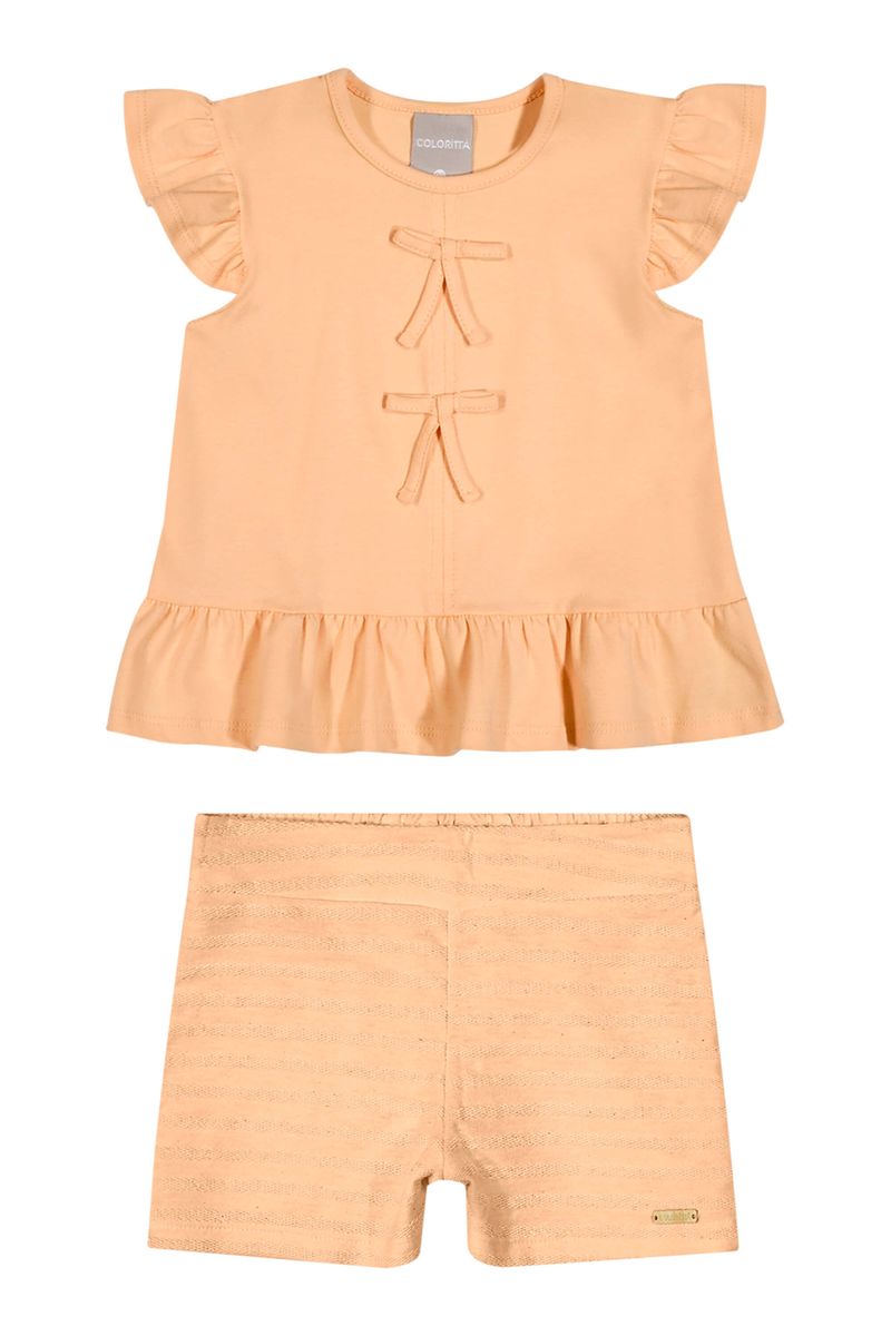 • Conjunto composto por blusa e short • Feito em cotton leve e malha linho listrado • Possui mangas curtas com babado • Detalhe frontal com laços • Elástico no cós • Ideal para passeios em dias de sol