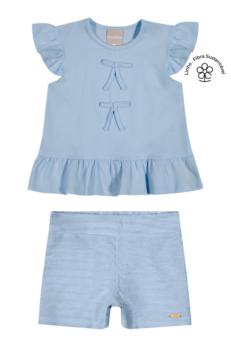 • Conjunto composto por blusa e short • Feito em cotton leve e malha linho listrado • Possui mangas curtas com babado • Detalhe frontal com laços • Elástico no cós • Ideal para passeios em dias de sol