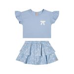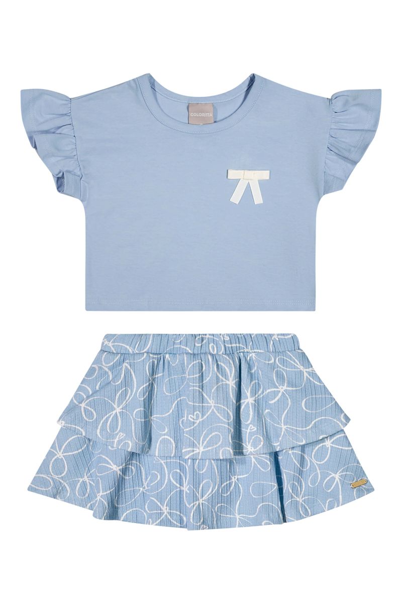 • Conjunto composto por blusa e short • Feito em cotton leve e malha canelada trabalhada • Modelagem cropped • Estampa de laços desenhados e aplique com laço • Saia de babados com elástico no cós • Possui short interno • Ideal para aniversários e passeios