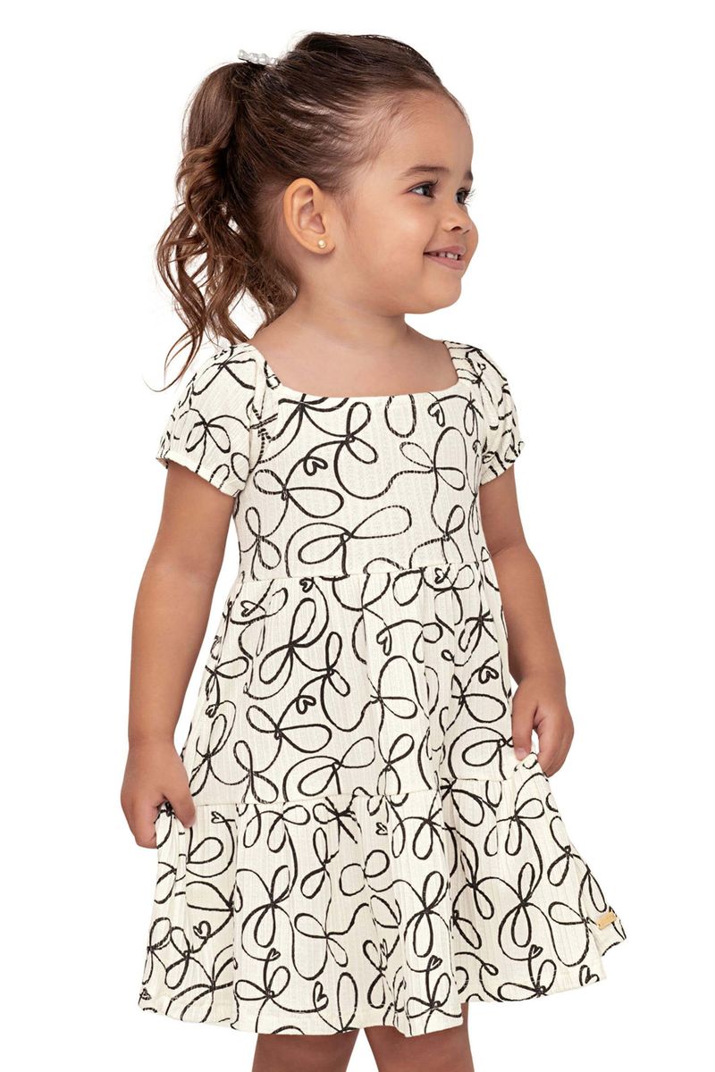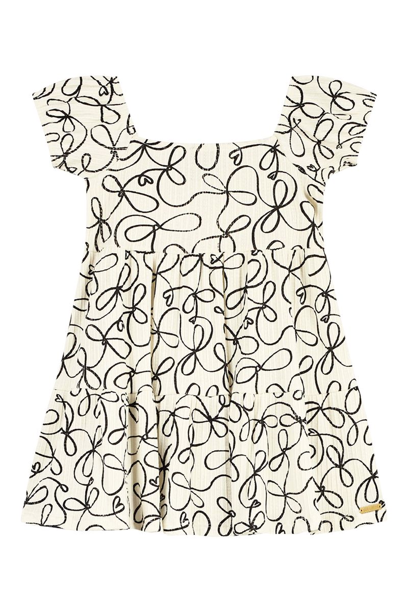 • Feito em malha canelada trabalhada • Modelagem soltinha • Mangas curtas bufantes • Estampa de laços desenhados • Ideal para momentos especiais