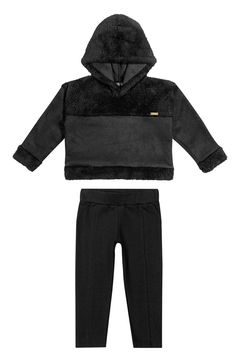 • Conjunto composto por casaco e legging • Feito em pelo dublado suede e moletom ponto roma • Possui mangas longas • Possui capuz • Detalhes em recorte com texturas diferentes • Elástico no cós • Ideal para passeios e viagens em família