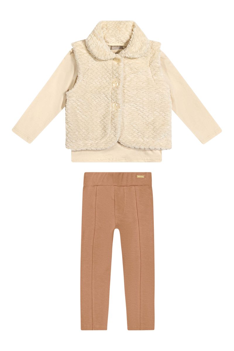 • Conjunto composto por blusa, colete e legging • Feito em cotton leve, pelo trançado e molecotton felpado • Blusa com mangas longas • Estampa floral com strass • Colete com abertura em botões e gola dupla • Elástico no cós • Ideal para momentos de lazer