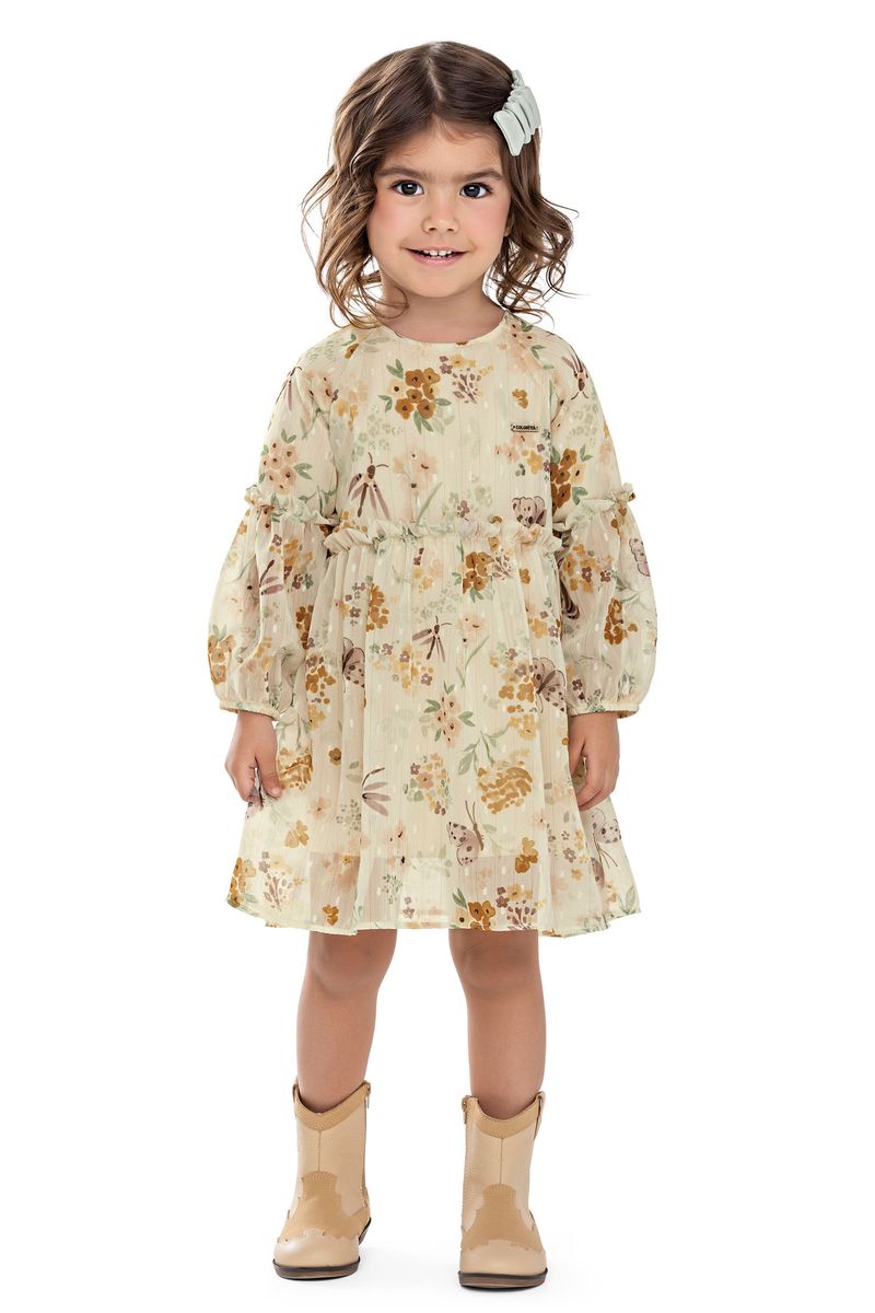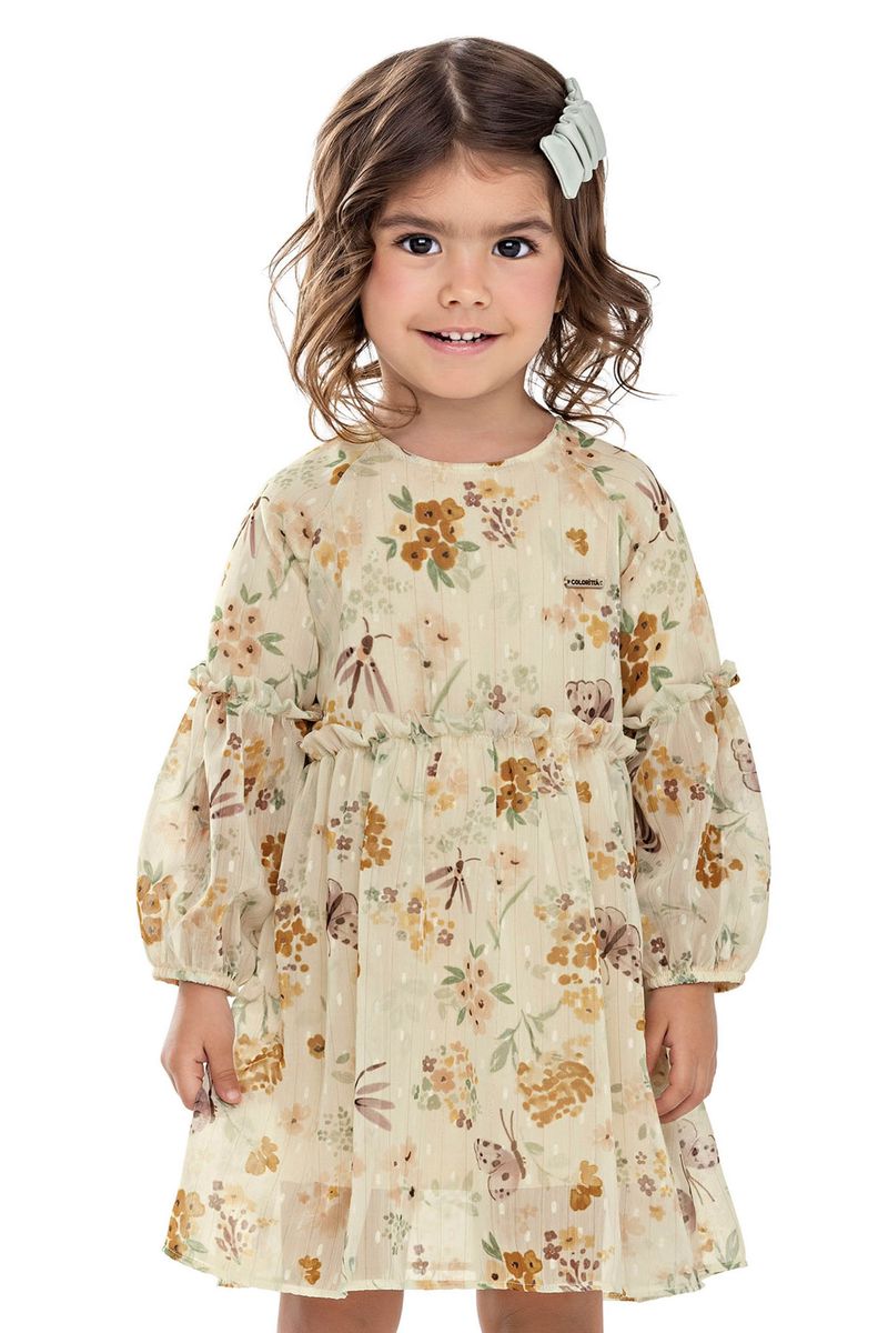 • Feito em chiffon com lurex • Mangas longas e cintura com frufrus • Fechamento em botão nas costas • Estampa floral • Ideal para ocasiões especiais, como festas